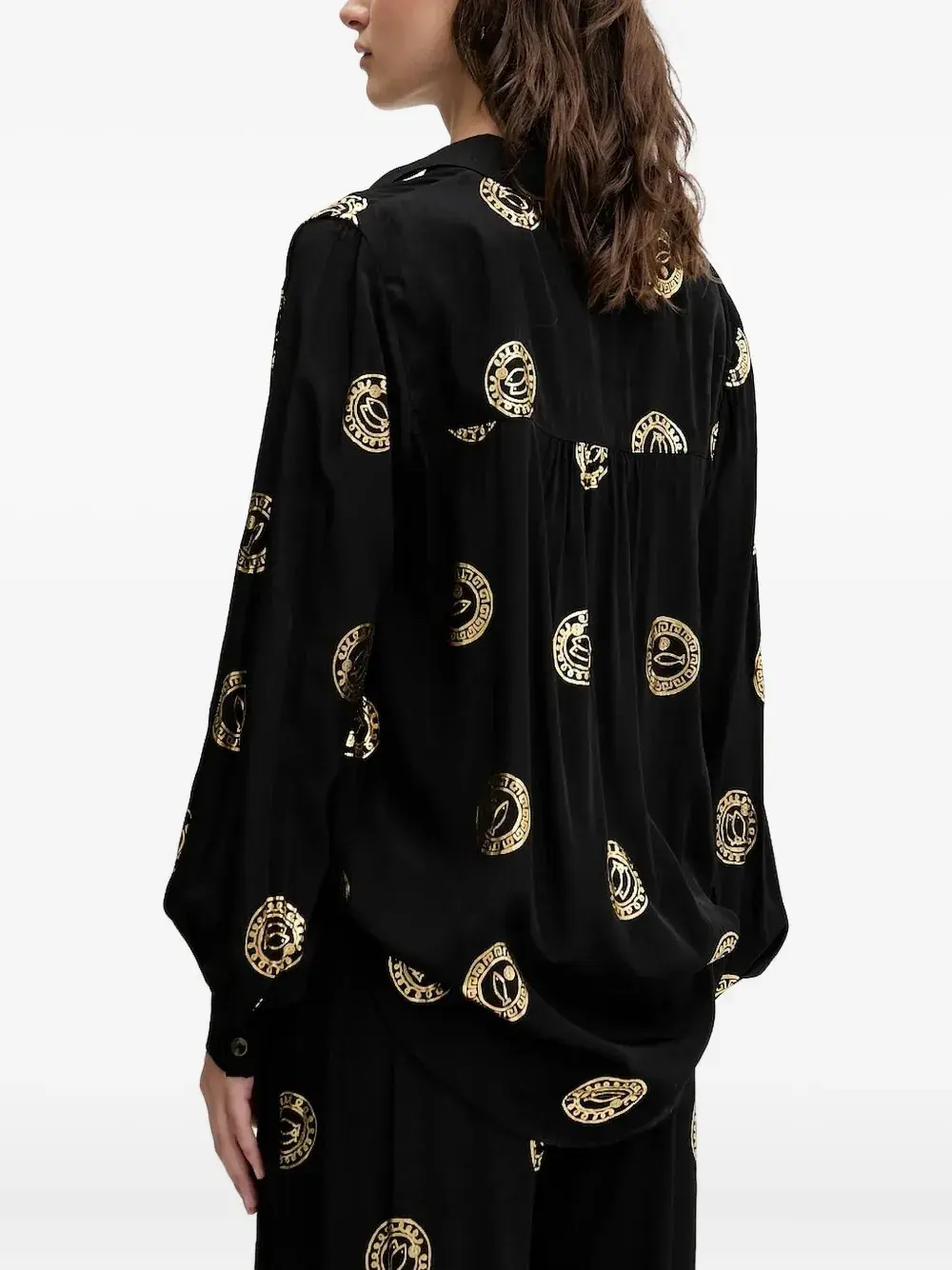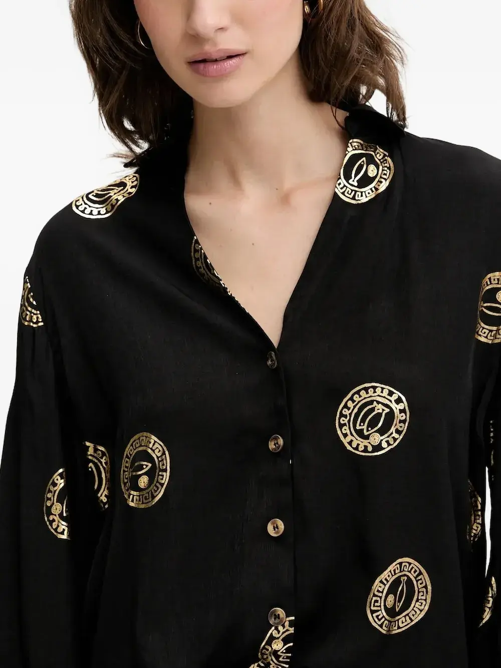 Длинные рукава, застежка на пуговицы с металлическим принтом черного золотистого оттенка