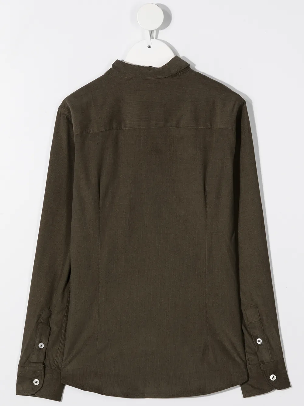 Классический воротник, застежка на пуговицах спереди, длинные рукава, манжеты на пуговицах, закругленный подол и металлический логотип.