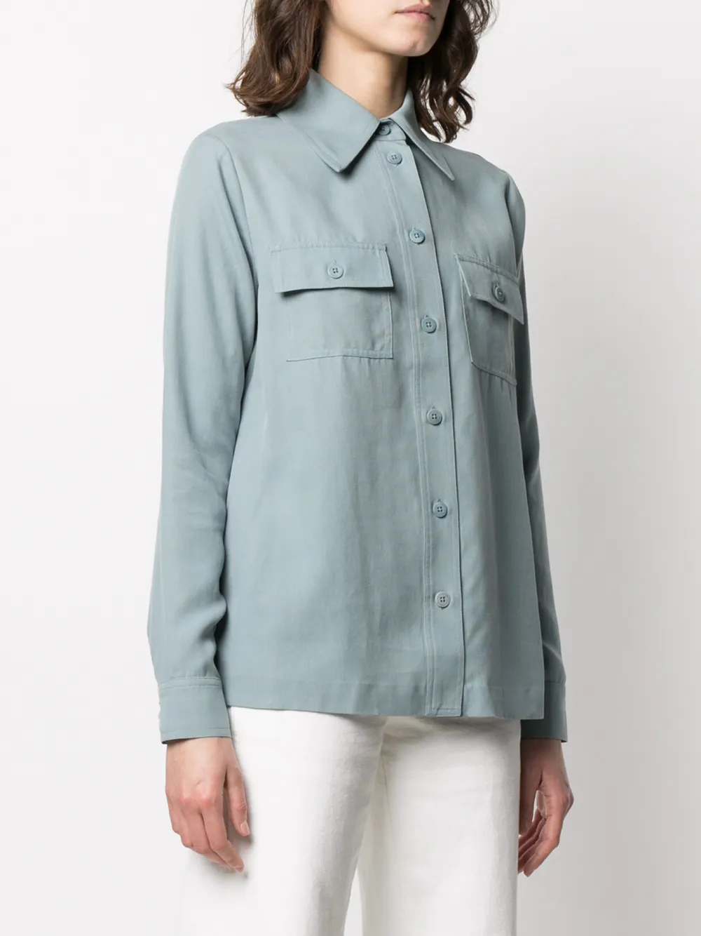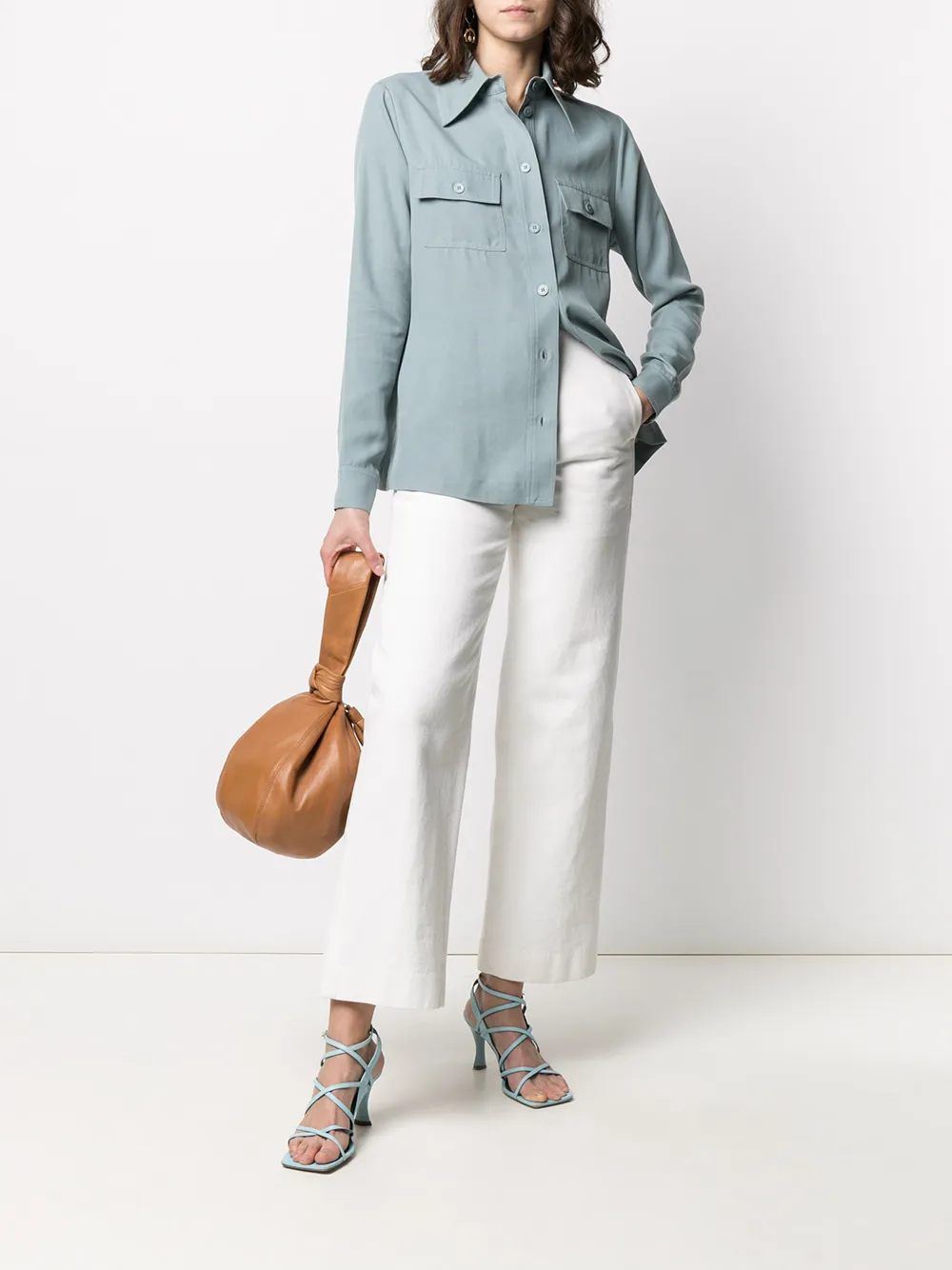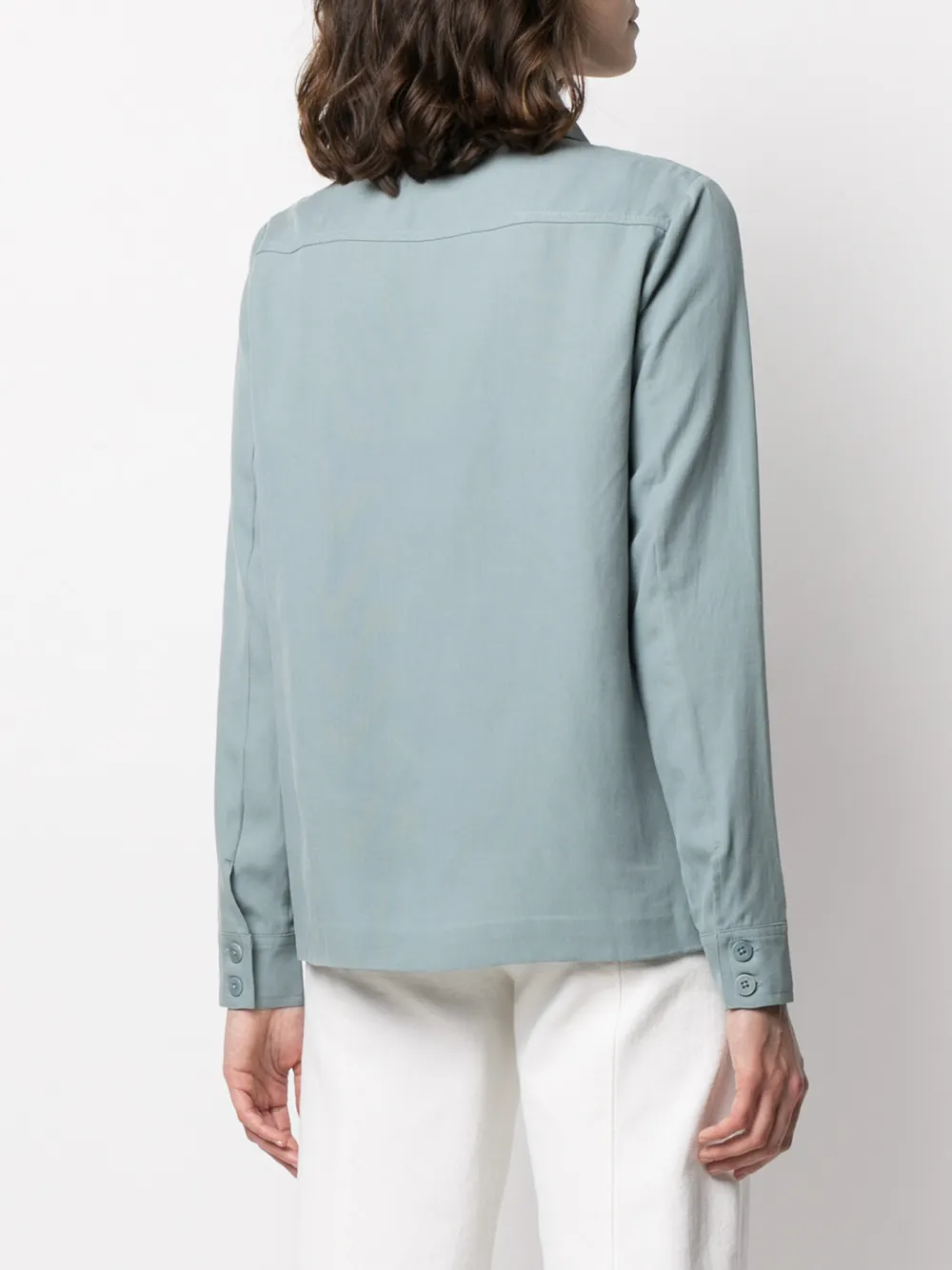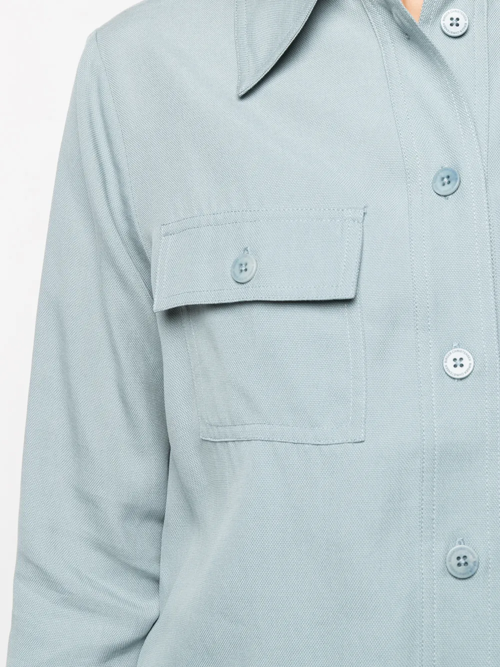 Классический воротник, два передних кармана с клапанами, длинные рукава, застежка на пуговицах спереди и прямой подол.