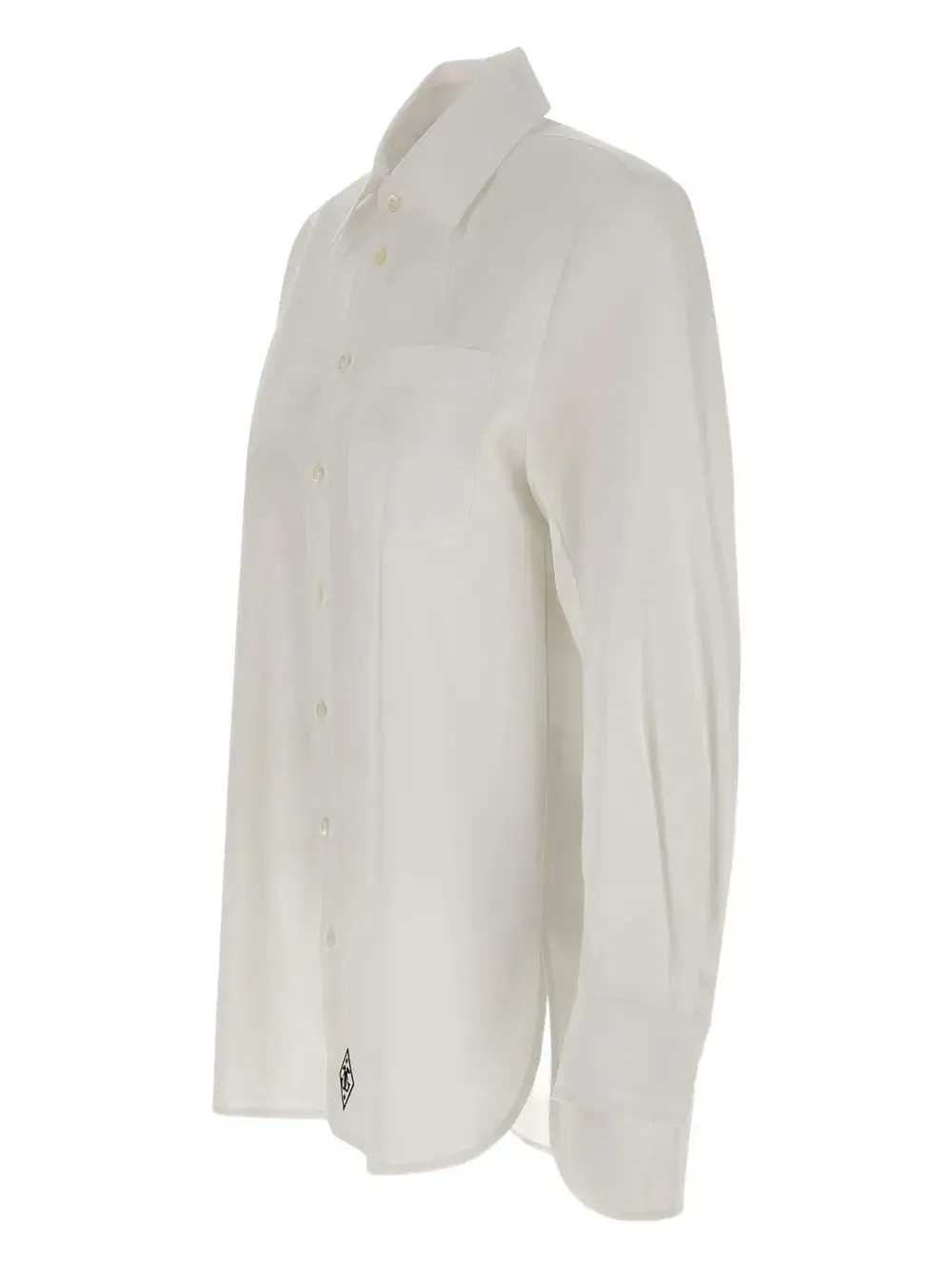 Застежка на белые пуговицы, длинные рукава, накладной карман, вышивка.