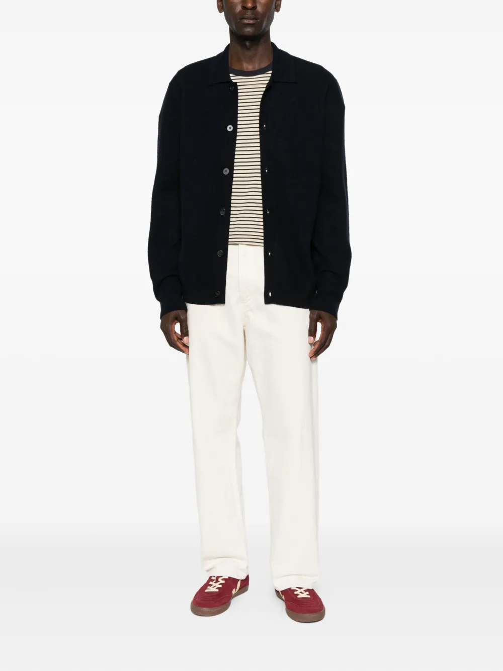 Черный воротник, застежка на пуговицы, длинные рукава, ребристые манжеты, прямой подол.