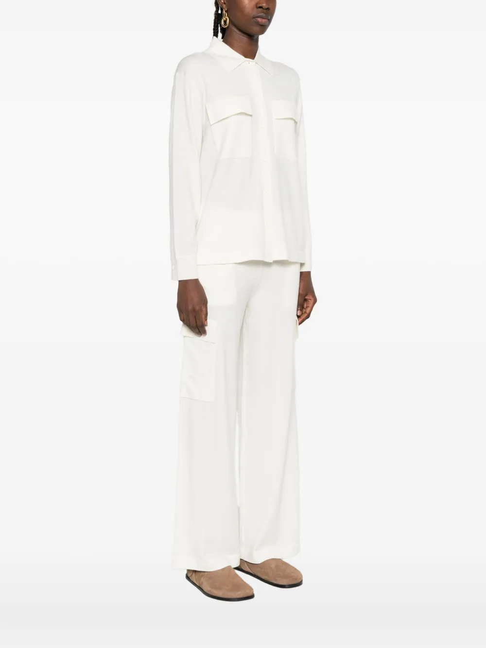 Белый воротник, длинные рукава, застежка на пуговицы спереди, два нагрудных кармана с клапанами, прямой подол.
