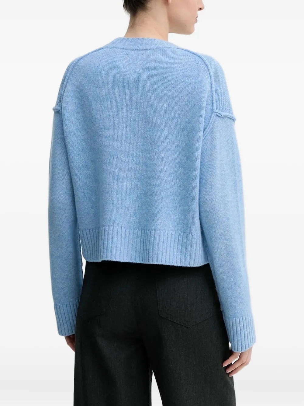 Синий V-образный вырез, застежка на пуговицы, ребристый подол, ребристые манжеты, длинные рукава.