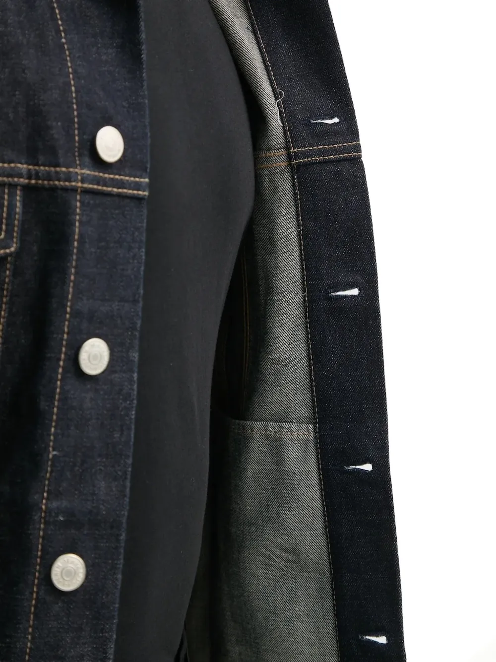 Темно-синий хлопковый материал, застежка на пуговицы, прямой подол, контрастная строчка.