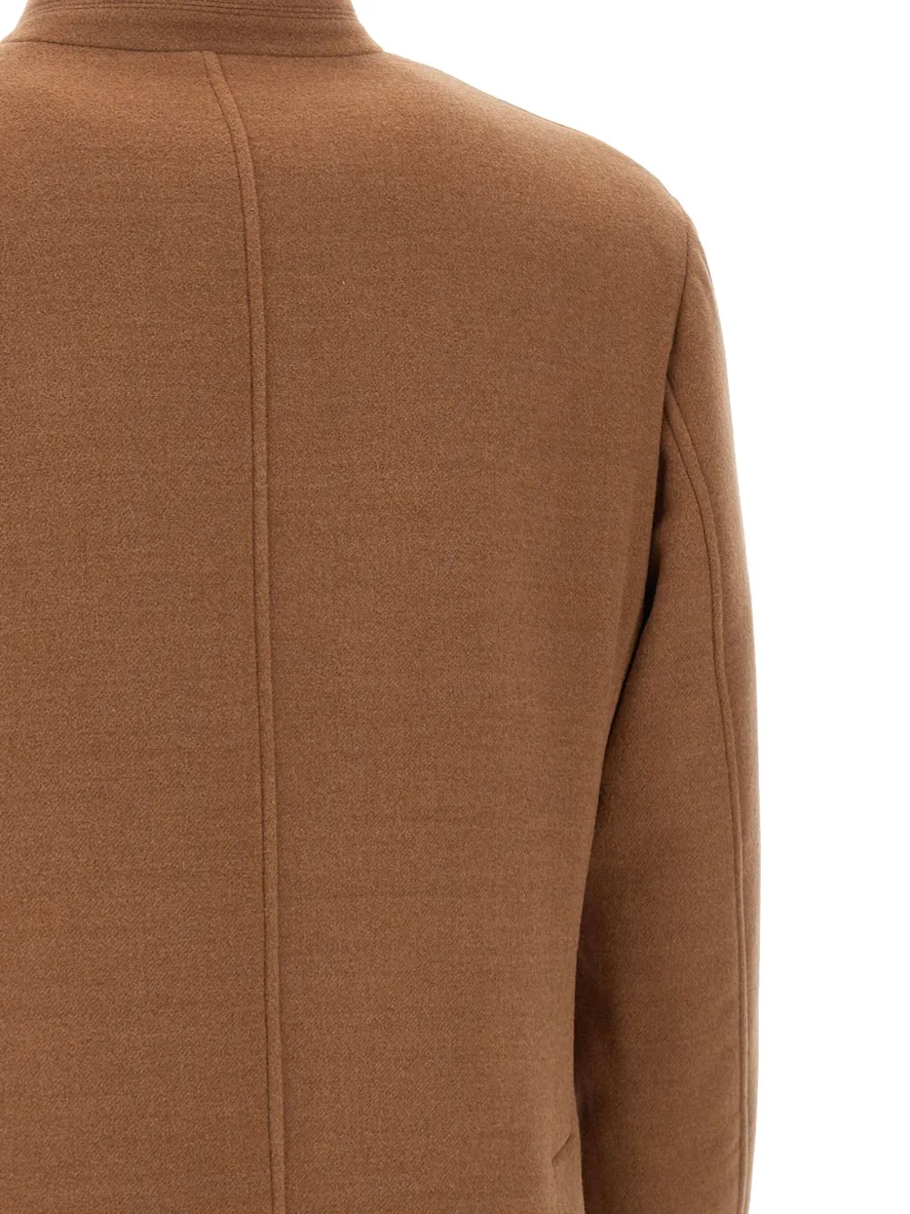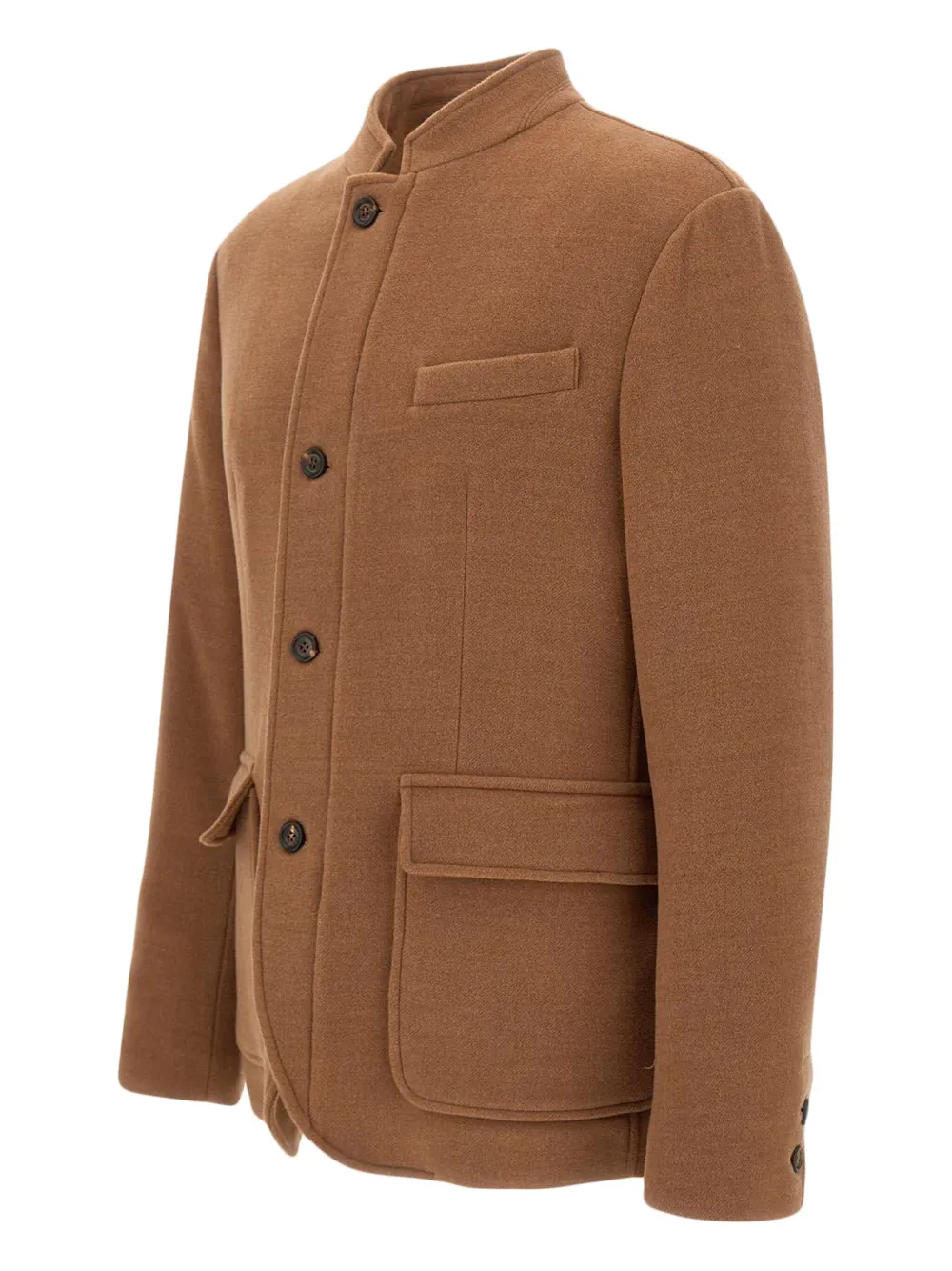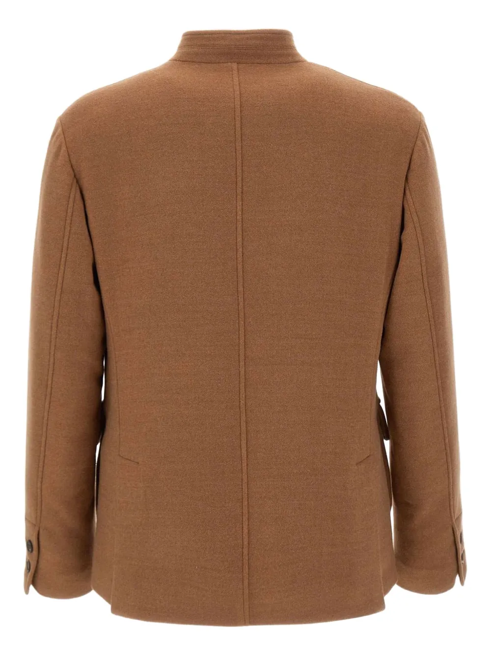 Коричневый воротник-стойка, застежка на пуговицы, карманы с клапанами, манжеты на пуговицах, детали швов