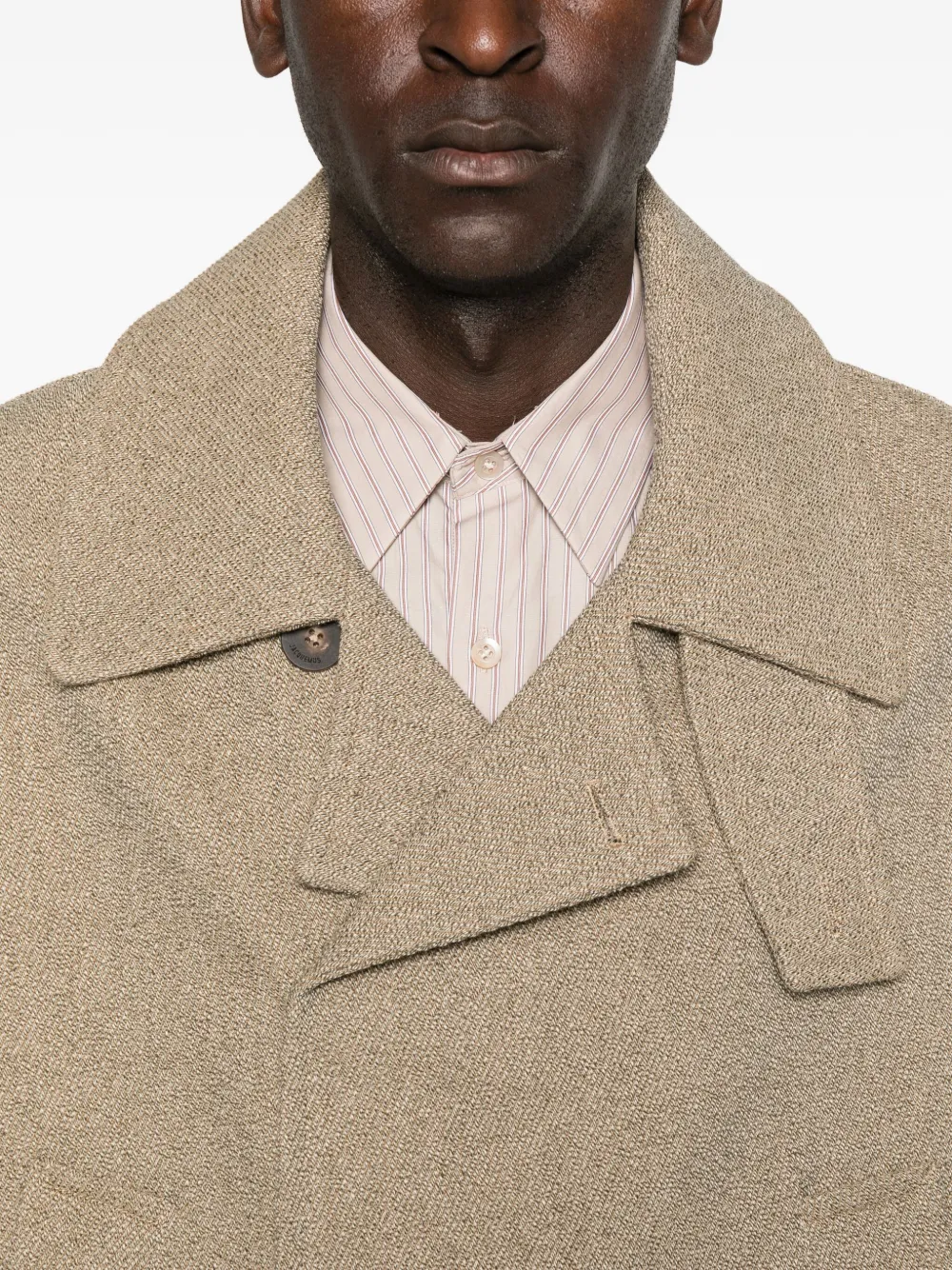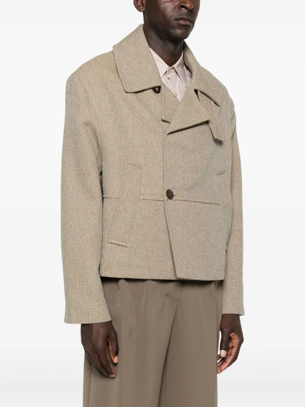 Бежевый шерстяно-хлопковый жакет, застежка на пуговицы спереди, отложной воротник, асимметричный подол, длинные рукава.