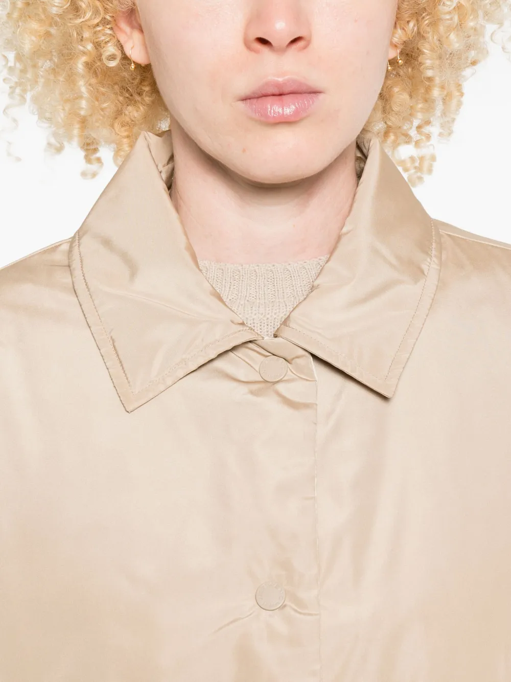 Бежевый, застежка на пуговицы, рукава три четверти, воротник-стойка, прямой подол.