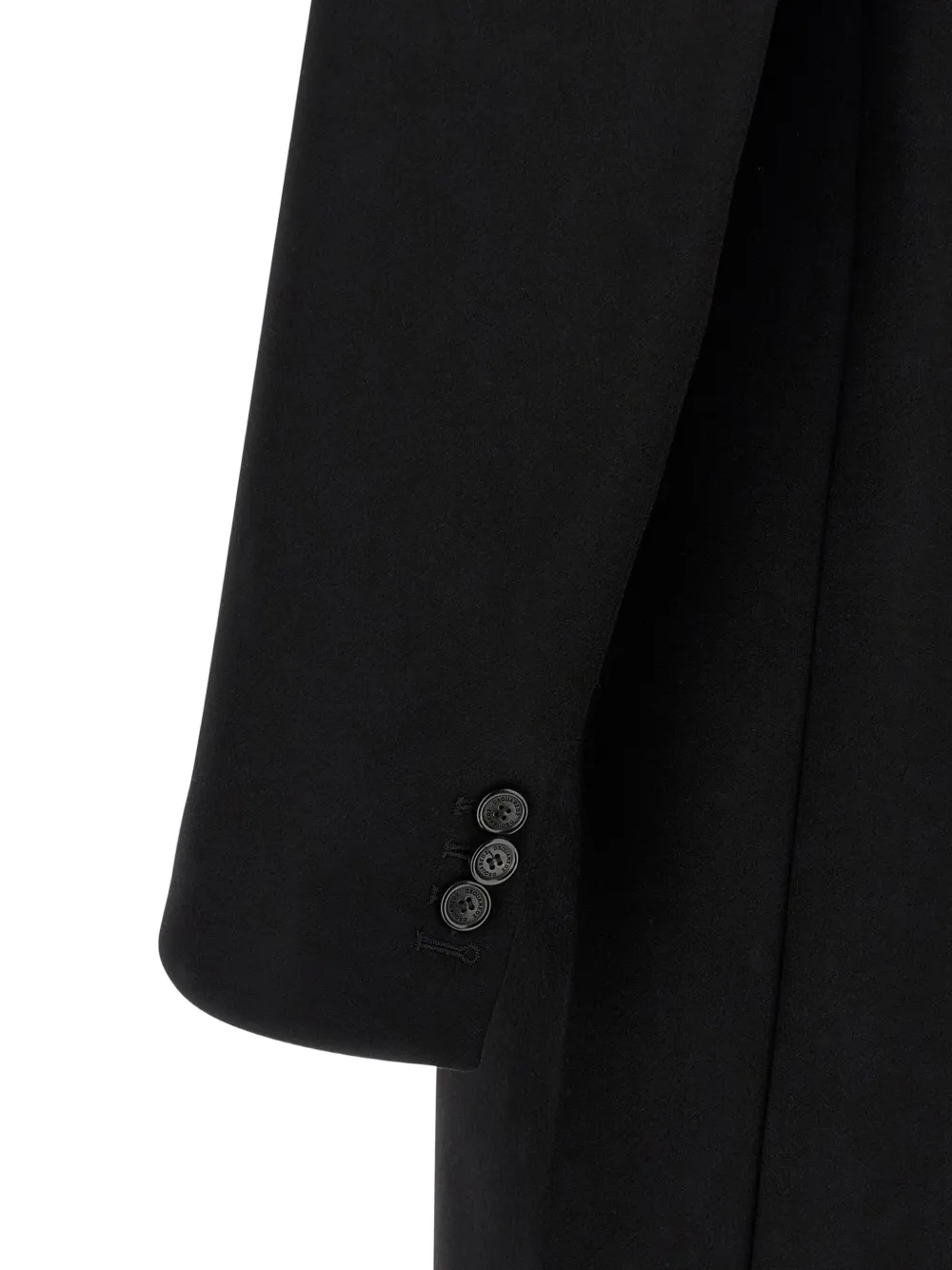 Однобортный пиджак из черной шерсти, длинные рукава, застежка на пуговицы, шлица по центру сзади.
