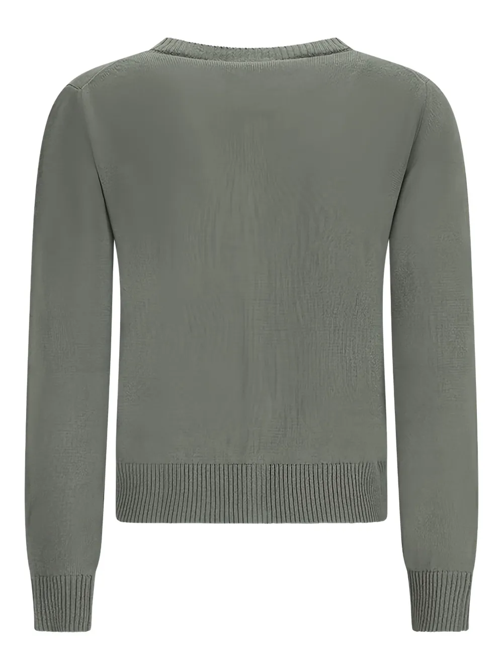 Круглый вырез, длинные рукава, застежка на пуговицы, ребристый подол, ребристые манжеты.