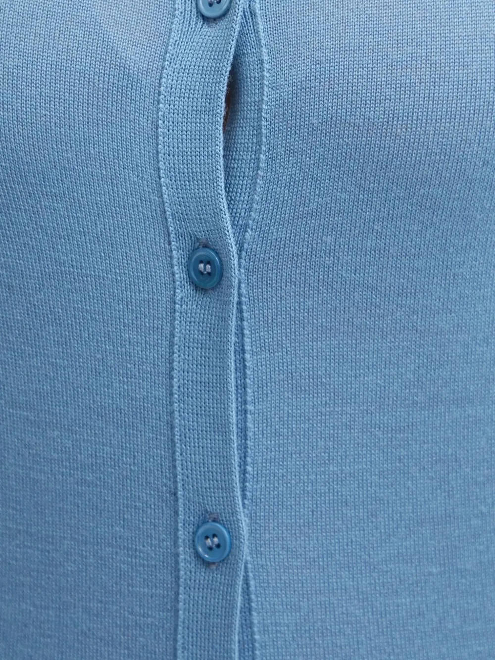 Светло-голубой круглый вырез, длинные рукава, застежка на пуговицы, ребристая отделка.