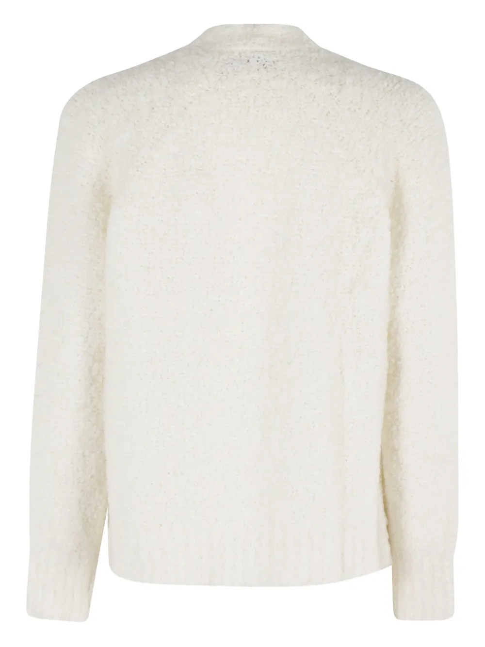 Застежка на пуговицы из нежно-белой ткани с пушистой текстурой, V-образный вырез, длинные рукава, ребристые отделки.
