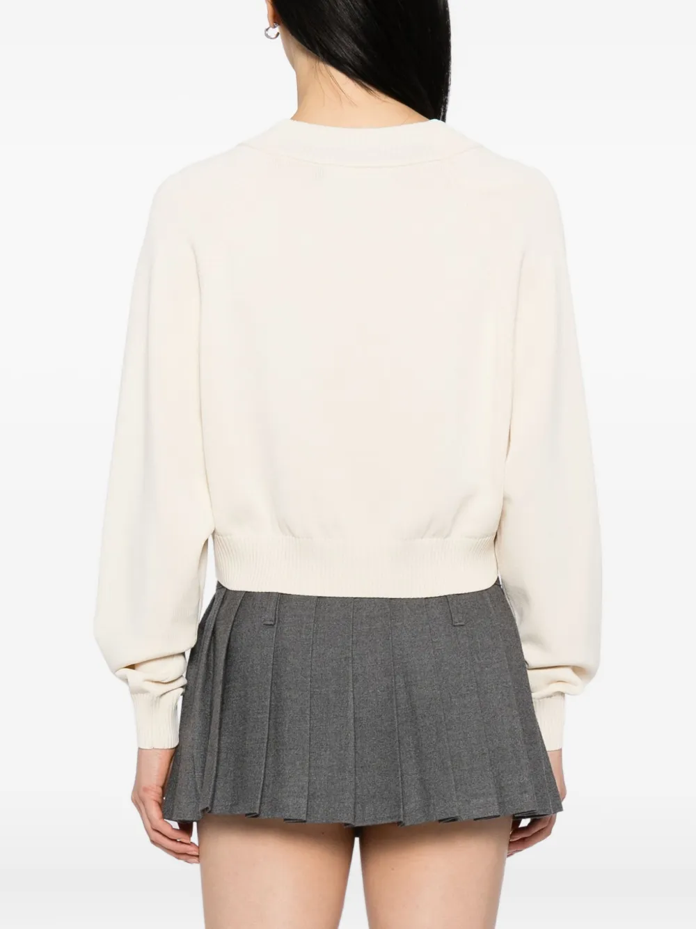 Застежка на пуговицы цвета экрю спереди, ребристый V-образный вырез, длинные рукава, ребристые манжеты и подол, вышитый логотип.