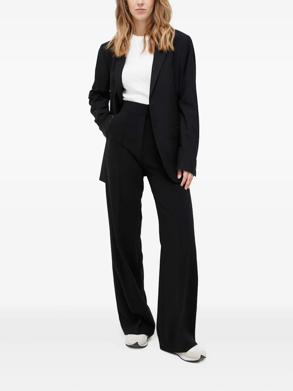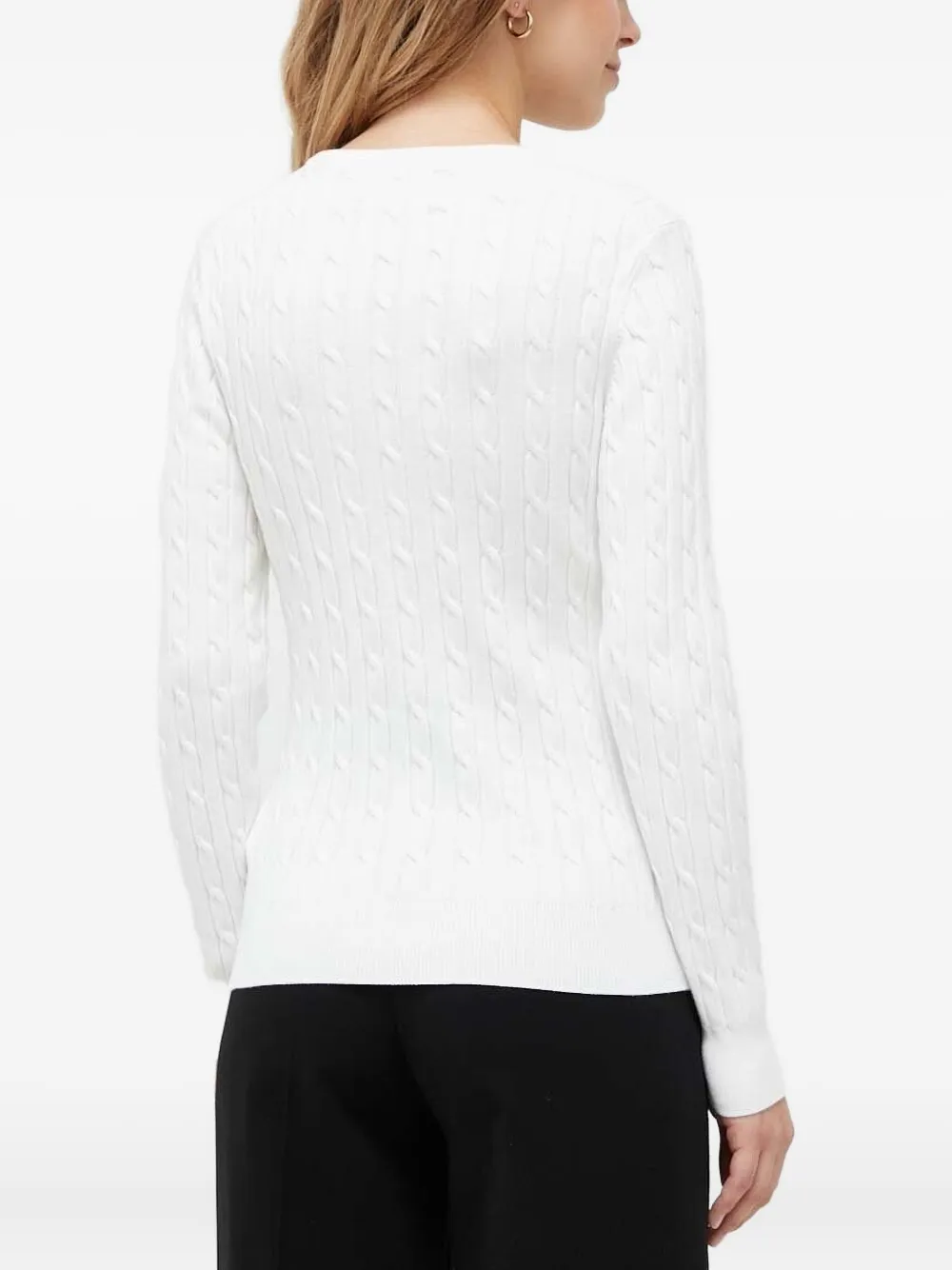 Белый трикотаж с косами, круглый вырез горловины, длинные рукава, вышитый логотип