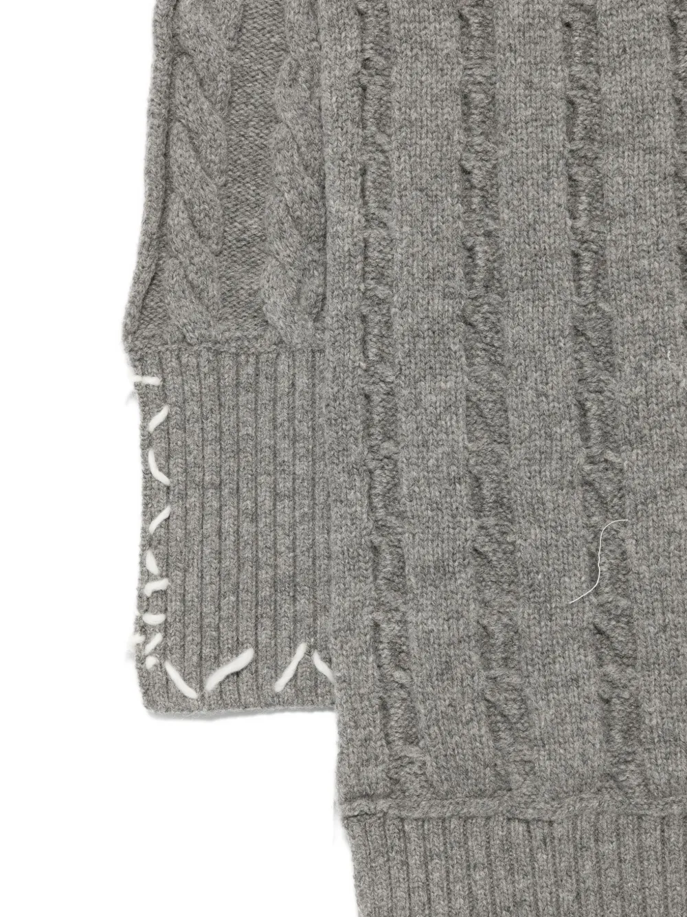 Серый трикотаж с косами, необработанные края, детали отделки, ребристый подол