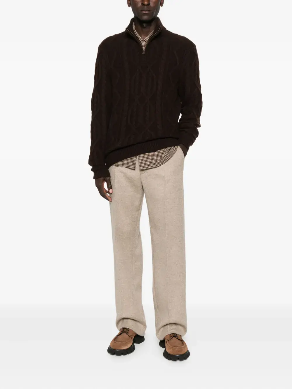 Коричневый трикотаж с косами, высокий ворот, застежка-молния до середины бедра, длинные рукава, прямой подол
