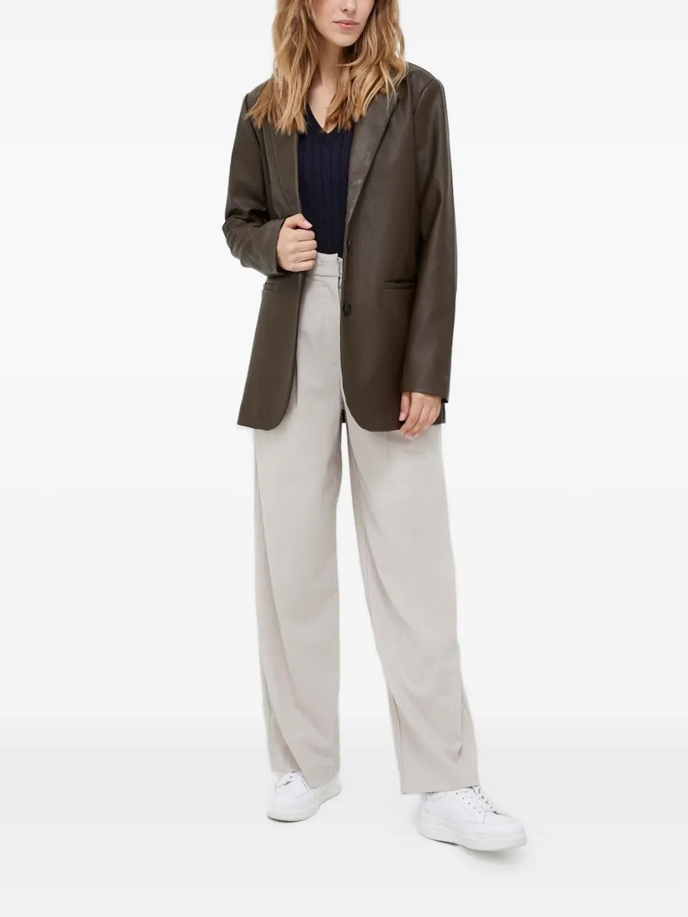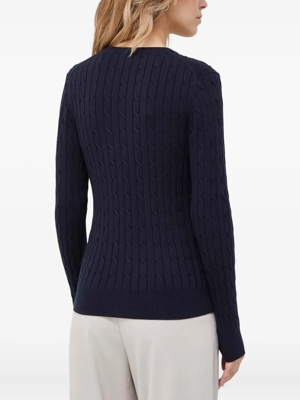 Темно-синий трикотаж с косами, V-образным вырезом, длинными рукавами, облегающим кроем, вышитым логотипом