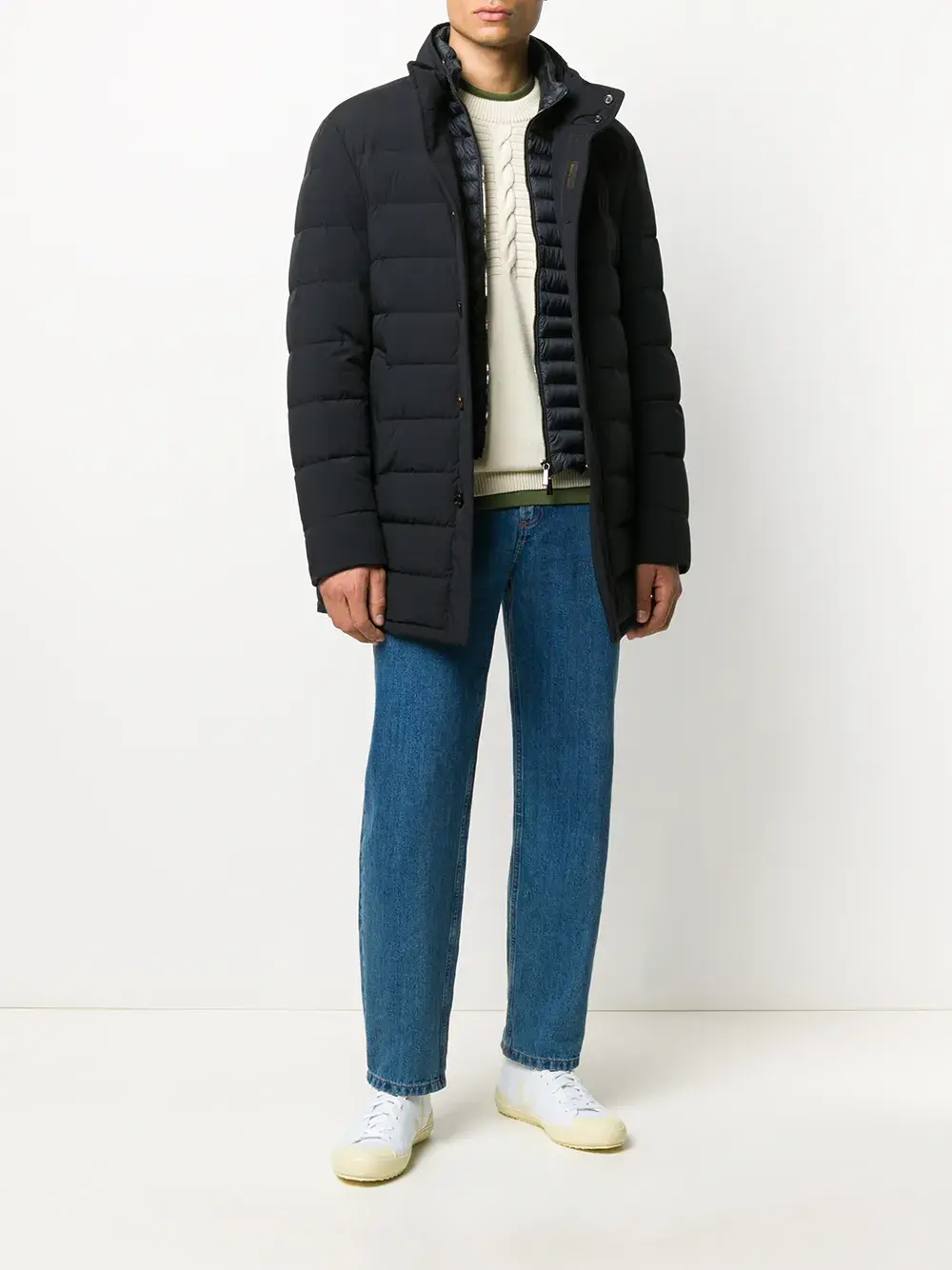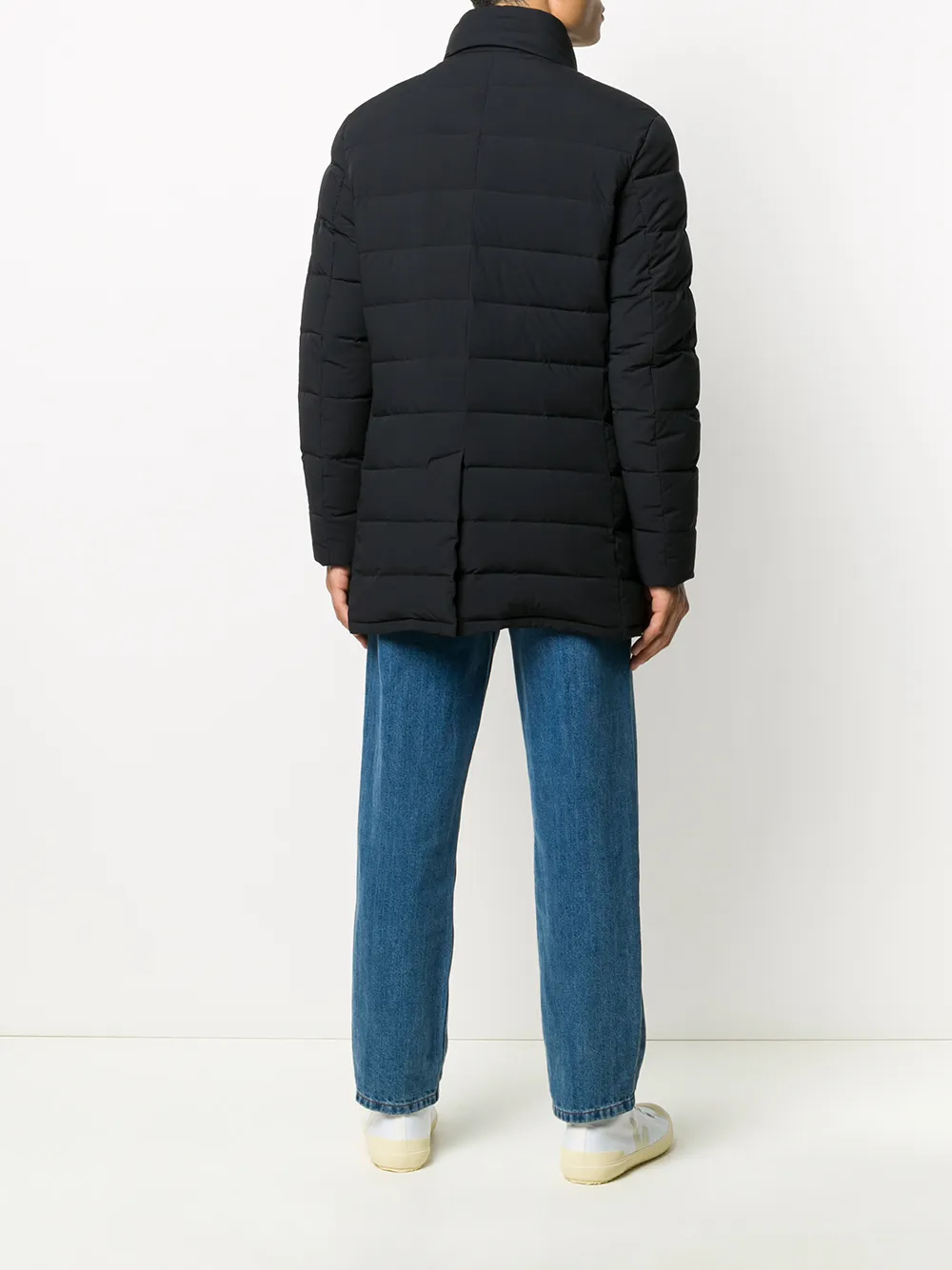 Дутый материал, воротник-стойка, застежка на пуговицах спереди, два передних кармана с листочкой, длинные рукава, шлица по центру сзади и прямой подол.