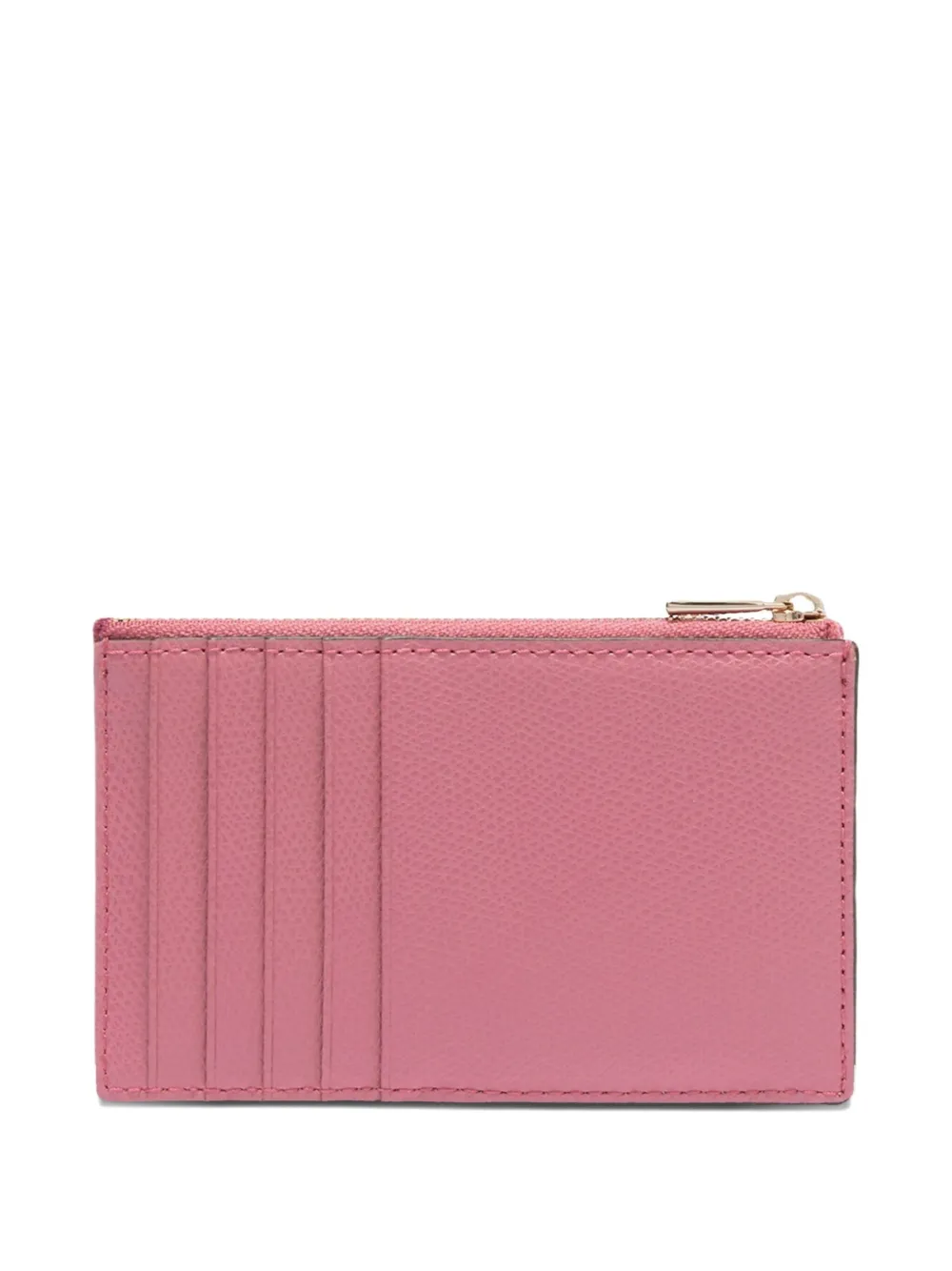 Верх из розовой кожи, застежка-молния, отделения для карт, золотистая бляшка с логотипом, внутренний тисненый логотип.