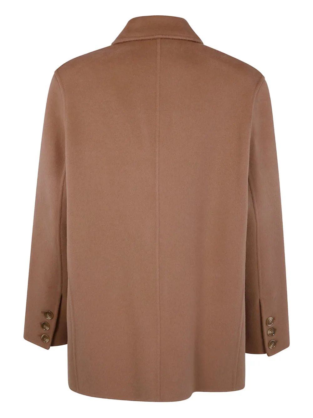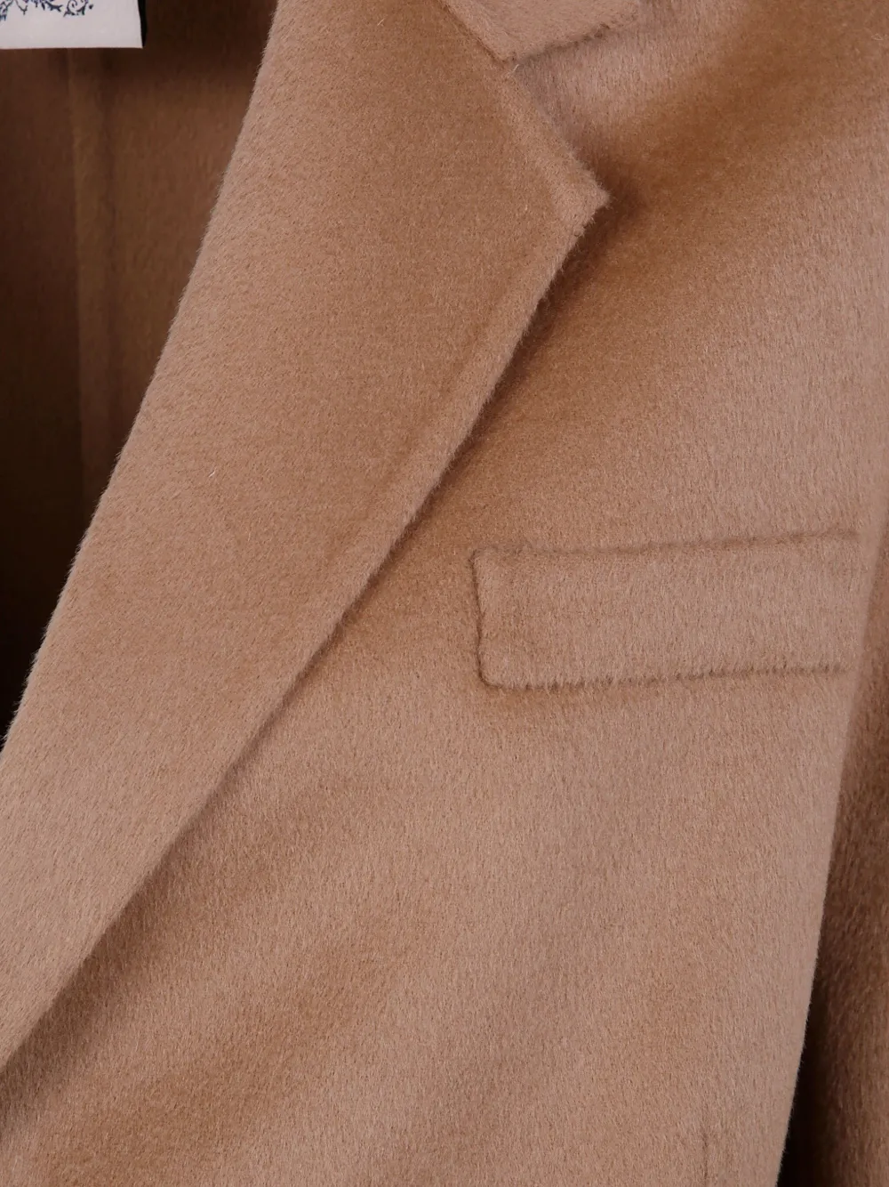 Шерстяной материал пустынно-коричневого цвета, две пуговицы, заостренные лацканы, карман с клапаном, длинные рукава