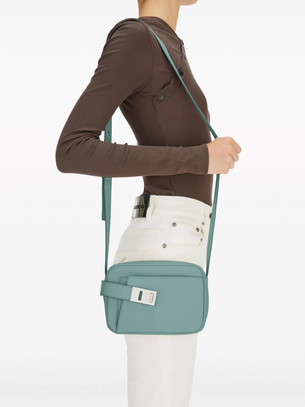 Подробнее о товаре: Original and snappy, this chic compact camera case is full of contemporary charm with unique features. On the front, a folding pocket is sealed by a strap that wraps from the back with Gancio clasp, while the top zip opening reveals a fully organized interior. Featuring a tonal piping around the edge, the soft calf leather is sumptuous and luxurious. Adjustable shoulder strap.