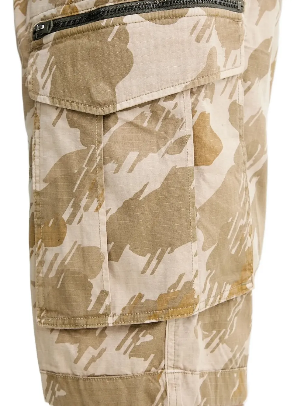 Бежевый камуфляжный рисунок, застежка-молния, карманы-карго, регулируемые лямки, застежка на пуговицы.