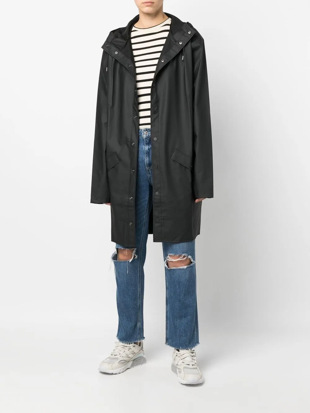 Водонепроницаемый материал, два кармана с клапанами по бокам, застежка на кнопках спереди, затягивающийся на шнурок капюшон, длинные рукава, длина миди и прямой подол. Conscious: Мы объединились с агентством Good On You, которое оценивает бренды по степени их влияния на животных, людей и планету в целом.