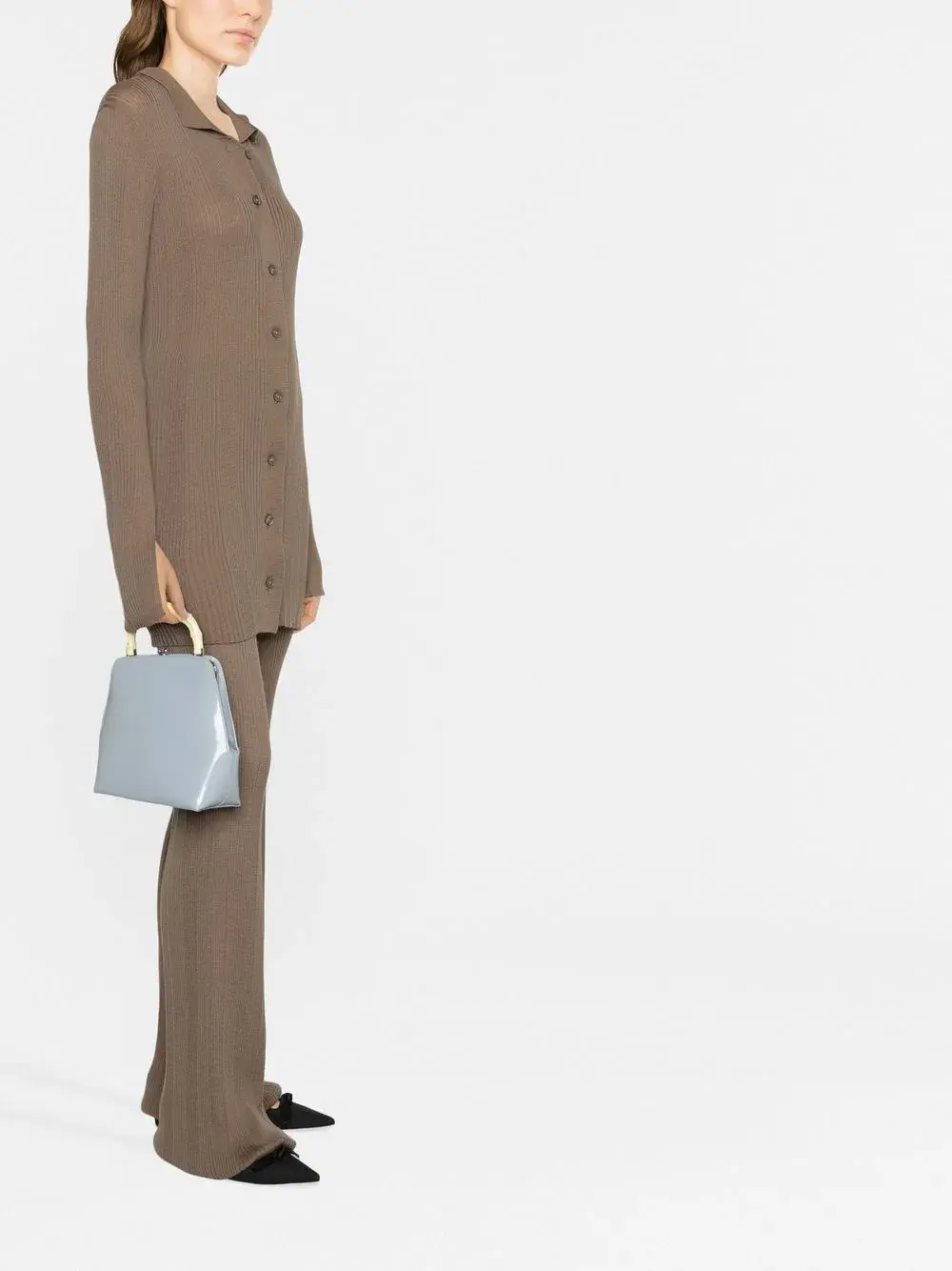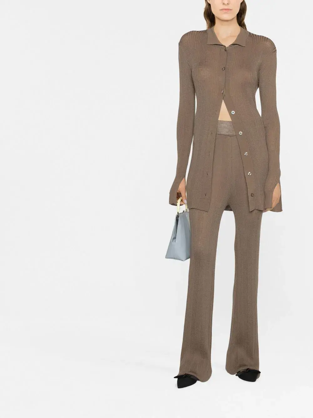 Коричневый, шерсть мериноса, трикотажный материал, длинные рукава, застежка на пуговицах спереди и прямой подол.
