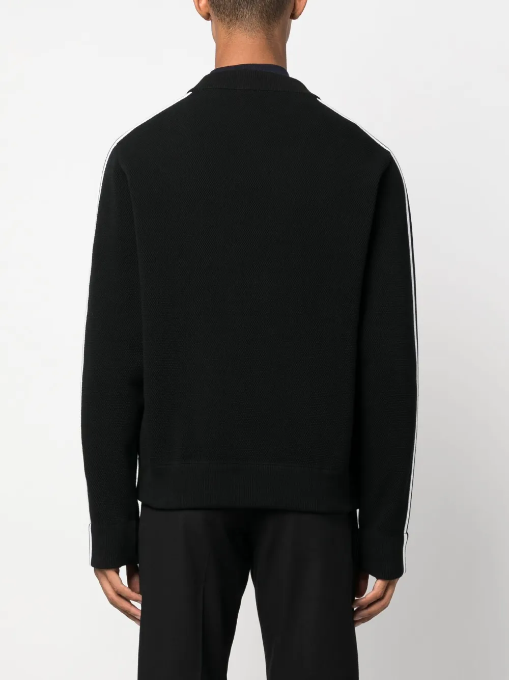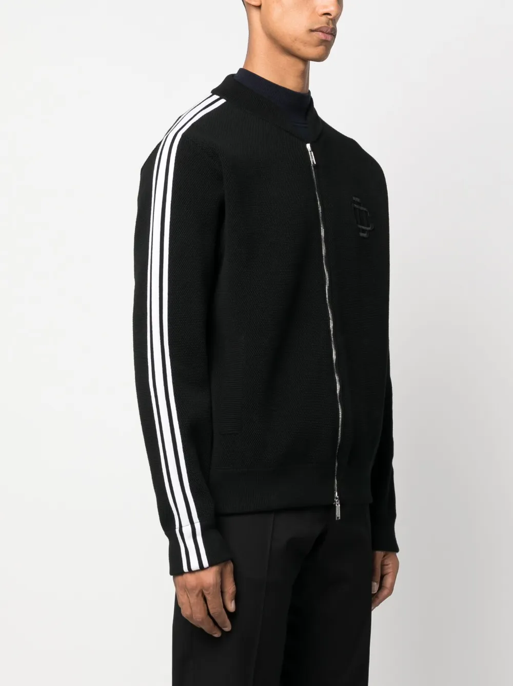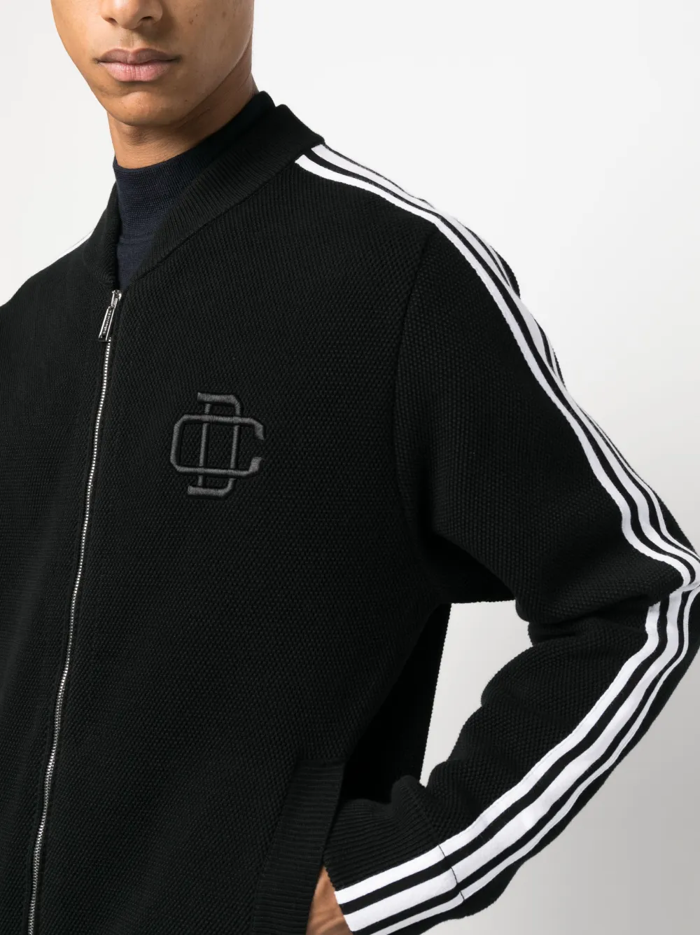 Черный/белый, хлопок, ажурная вязка, полоска сбоку, вышитый логотип на груди, воротник-стойка в рубчик, двусторонняя молния спереди, два прорезных кармана по бокам и длинные рукава.