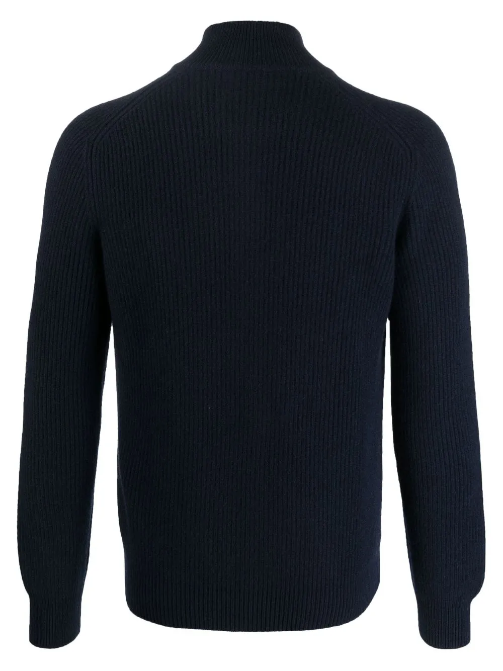 Темно-синий, кашемир, трикотаж в рубчик, круглый вырез, застежка на молнии спереди и длинные рукава.