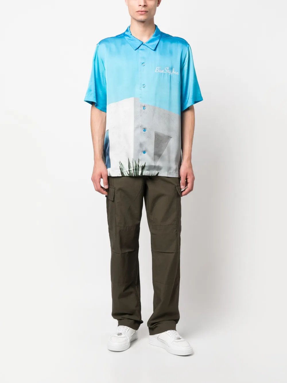 Нашивка с логотипом сзади, петли для ремня, застежка на молнии и пуговице спереди, два вшитых кармана по бокам, два накладных кармана по бокам и два кармана с клапанами сзади.
