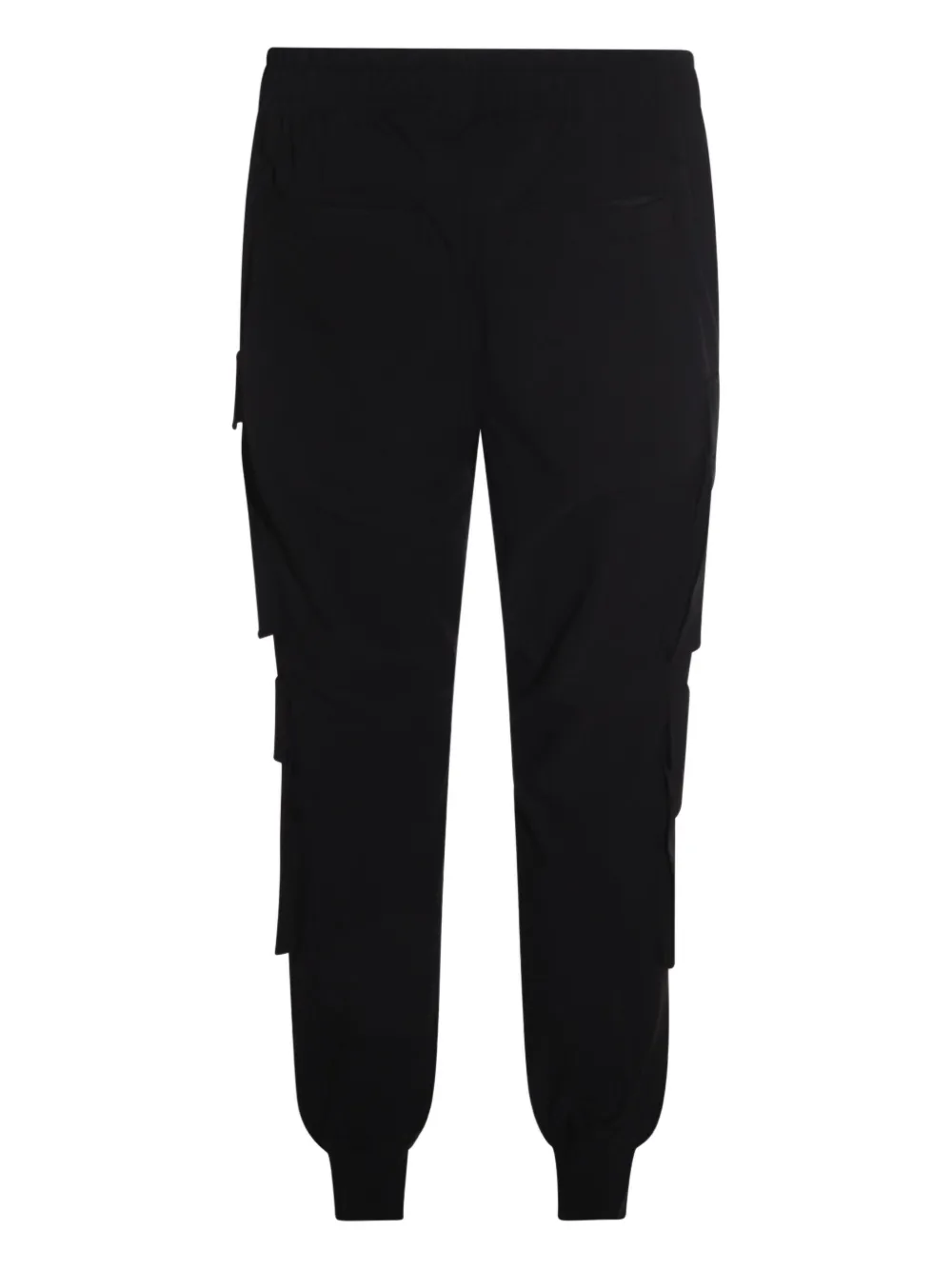 Черные брюки с несколькими карманами-карго, эластичным поясом и затягивающимся шнурком, манжетами по низу, прямыми штанинами.