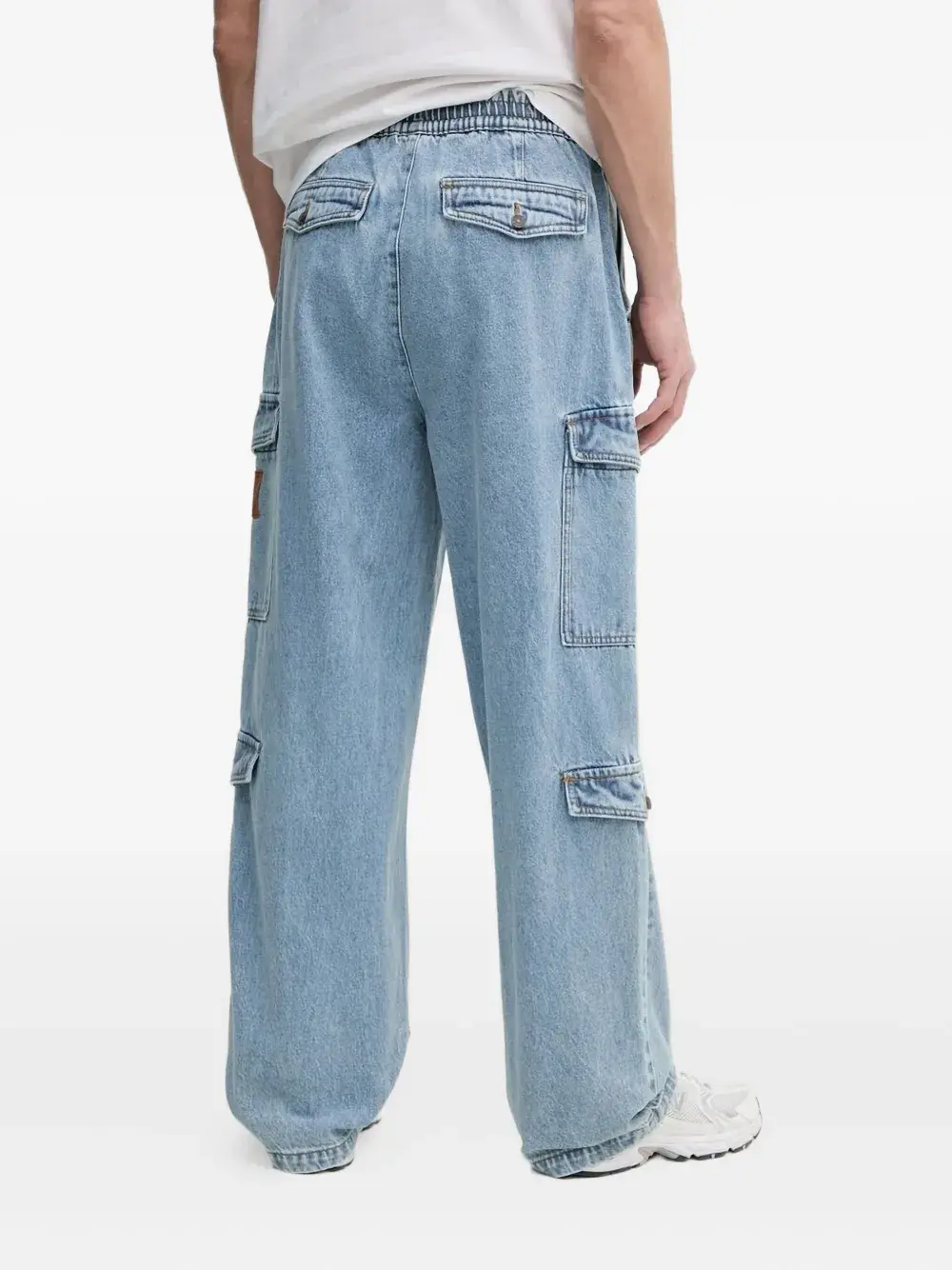 Светло-голубой, с несколькими карманами-карго, застежкой на пуговицы, прямыми штанинами и эластичным поясом.