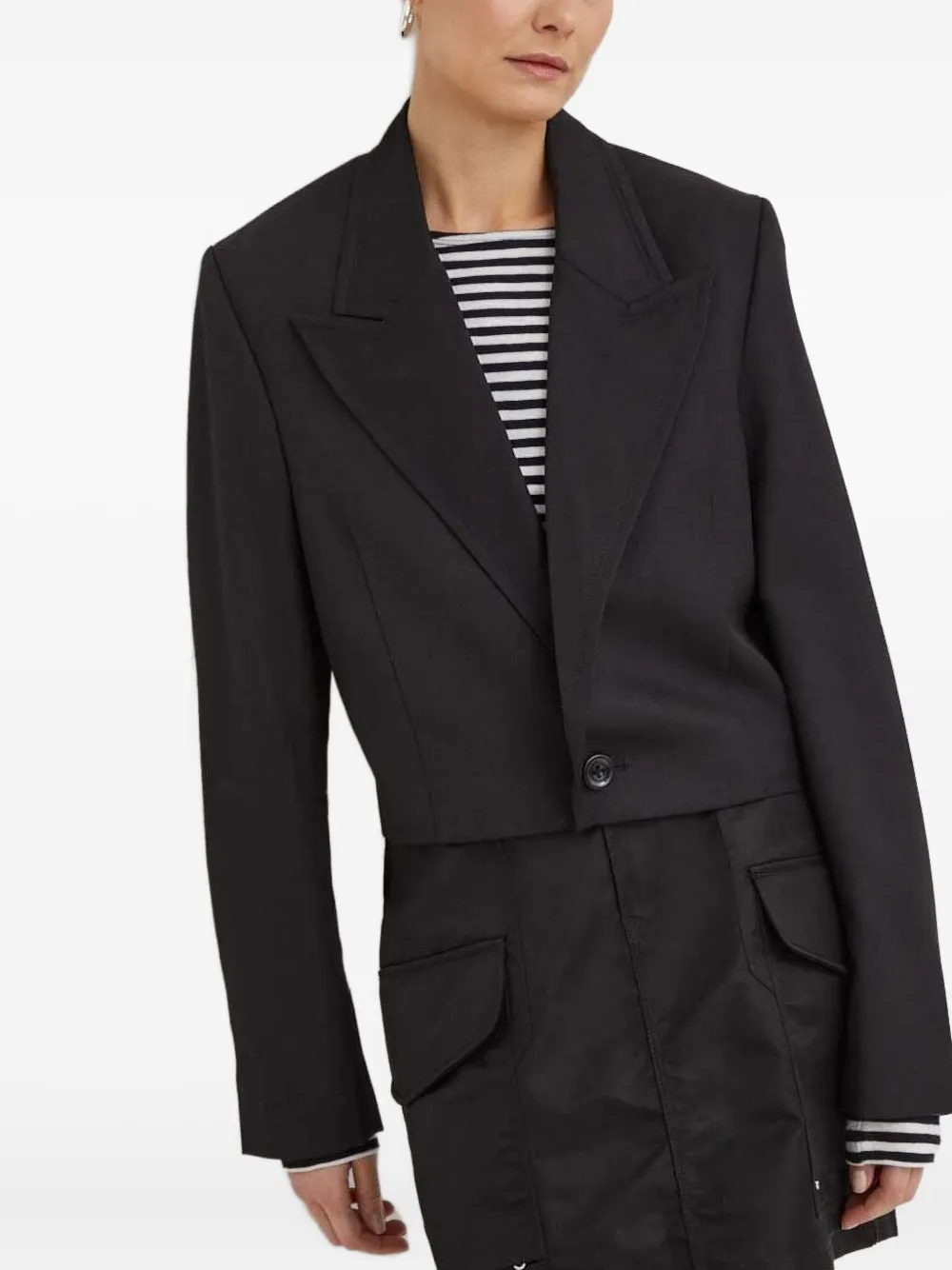 Черный, с несколькими карманами-карго, застежкой на пуговицы, прямым нижним краем и плоским передом.