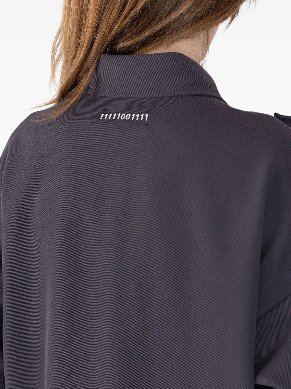 Серый воротник-поло, застежка на пуговицы, длинные рукава, накладные карманы, вышитые номера.