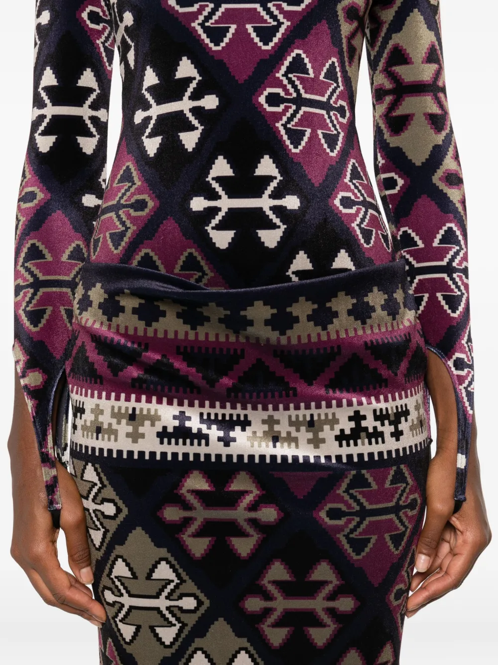 Темно-синий ковровый рисунок, высокий ворот, длинные рукава, бархатная текстура
