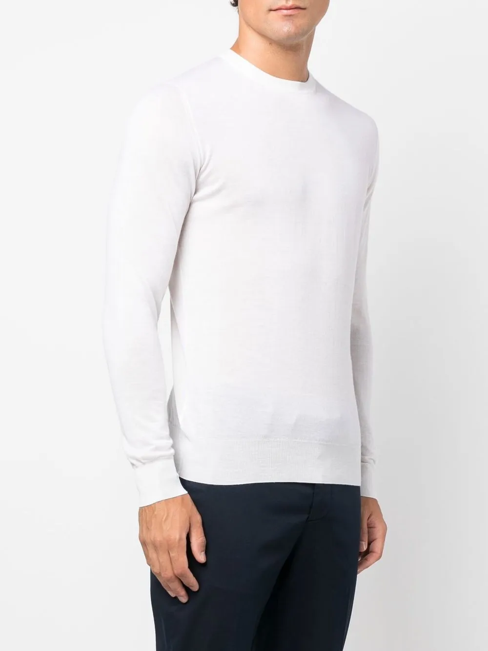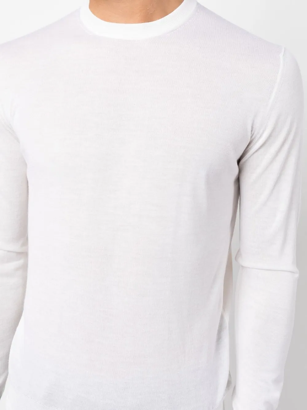 Белый, кашемир, тонкая вязка, края в рубчик, круглый вырез, длинные рукава и прямой подол.