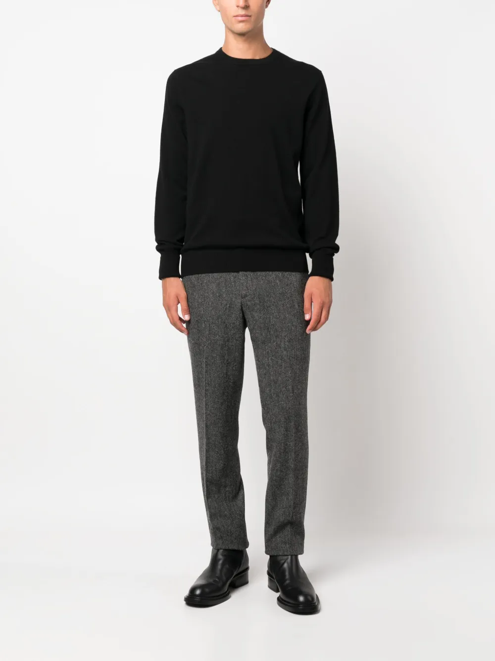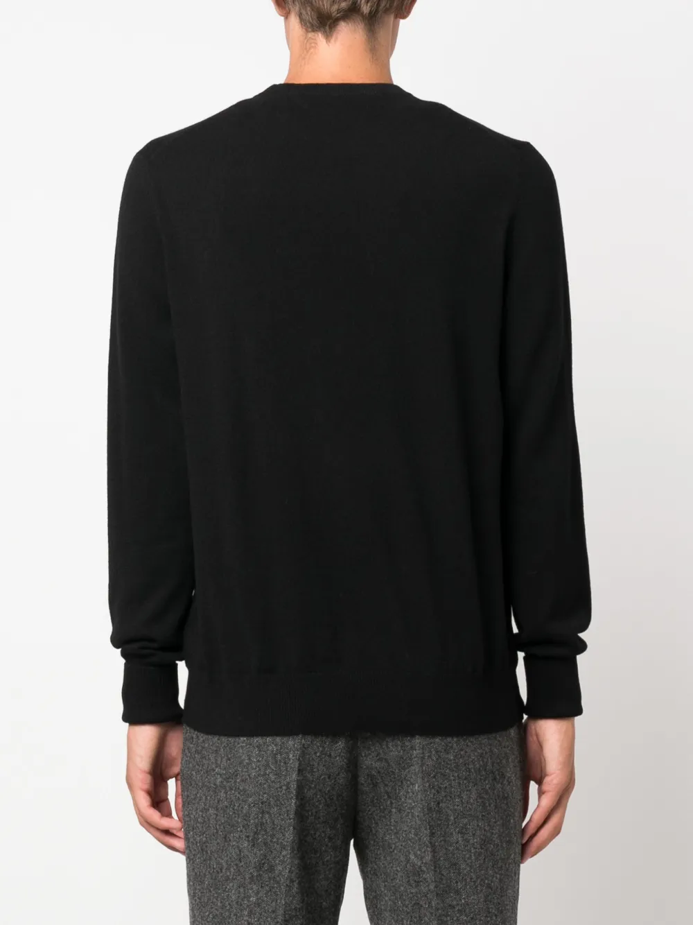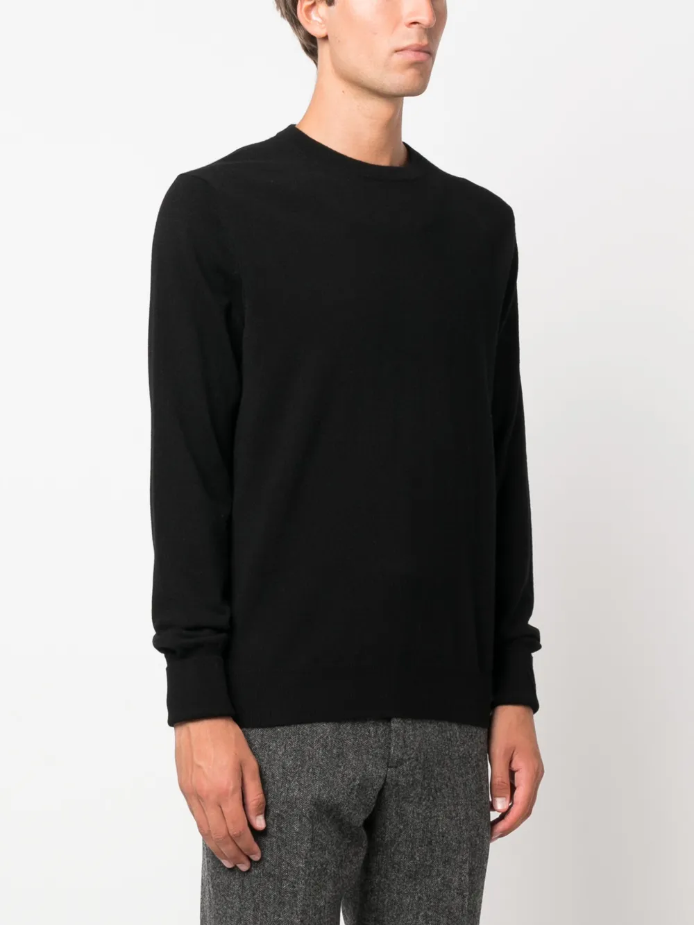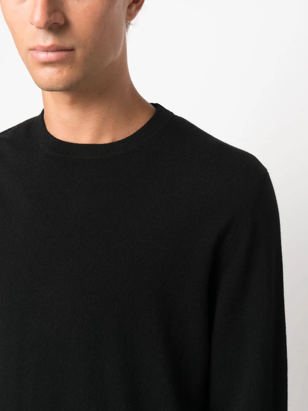 Черный, кашемир, трикотажный материал, круглый вырез и длинные рукава.
