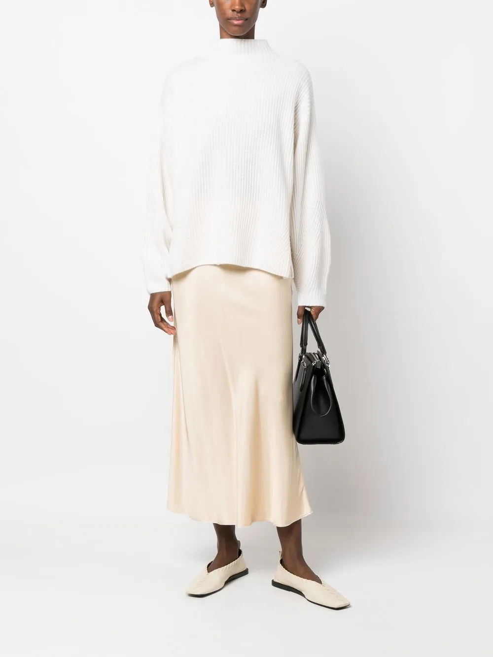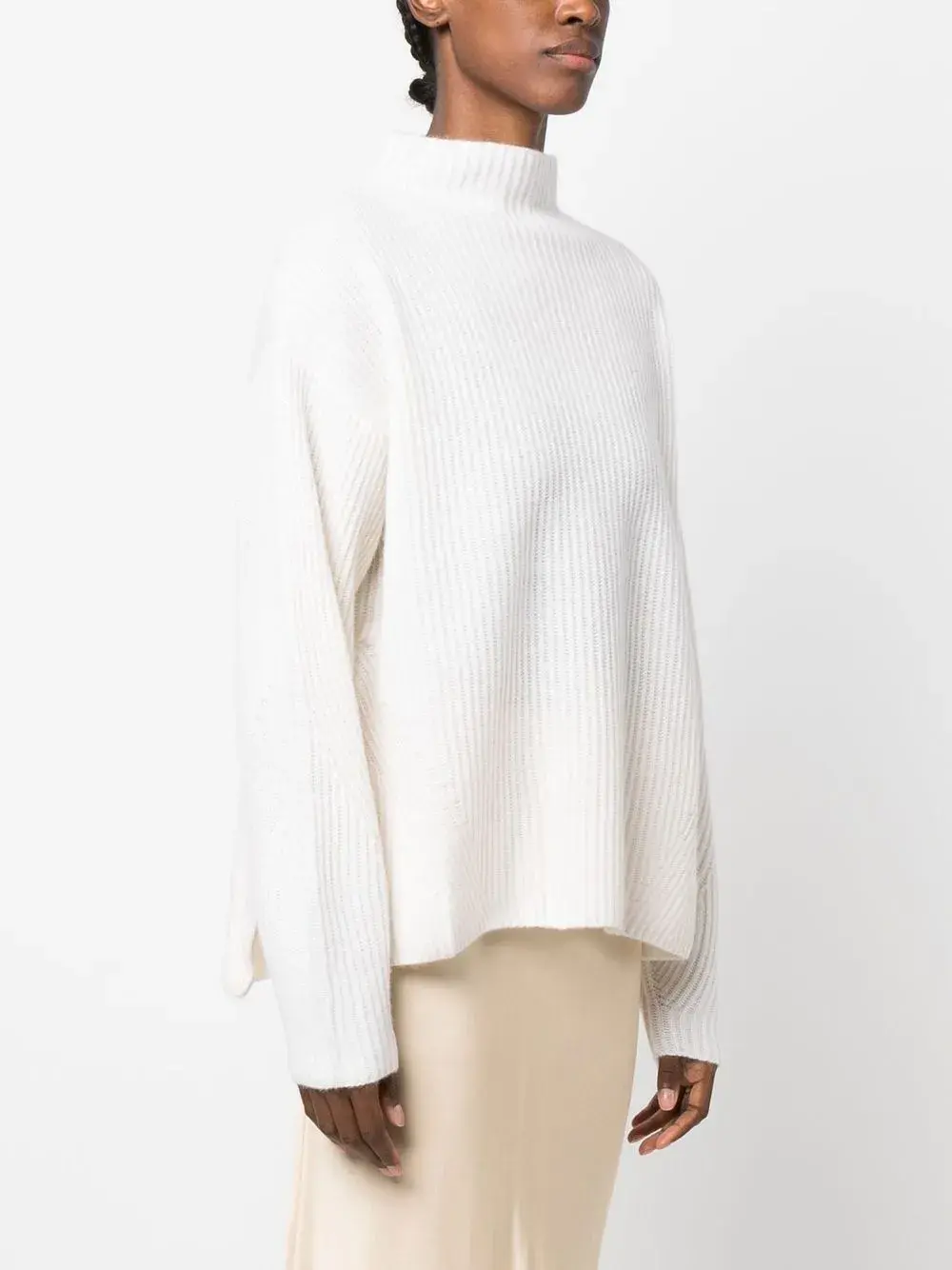 Кремовый, кашемир, трикотажный материал, трикотаж в рубчик, высокий воротник, приспущенные плечи и длинные рукава. Ответственный выбор: Мы объединились с агентством Good On You, которое оценивает бренды по степени их влияния на животных, людей и планету в целом. Этот бренд использует этичные по отношению к животным практики, поэтому получил хорошую оценку.