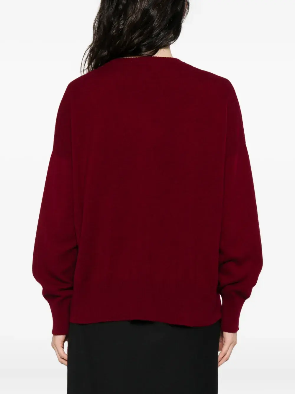 Темно-красный кашемир, круглый вырез горловины, длинные рукава, ребристые манжеты, прямой подол.