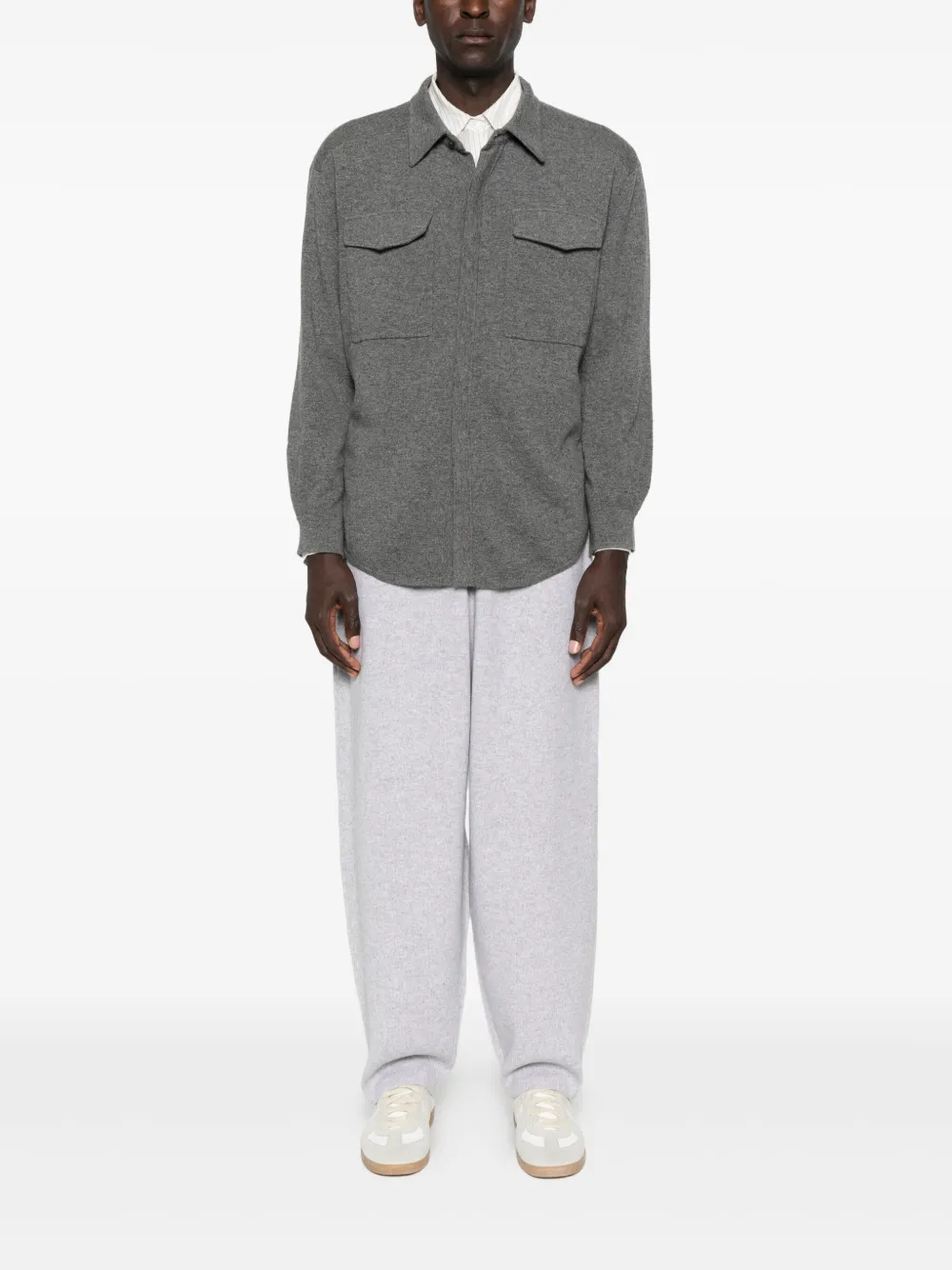 Эластичный пояс из светло-серого кашемира, прямые штанины, ребристые манжеты