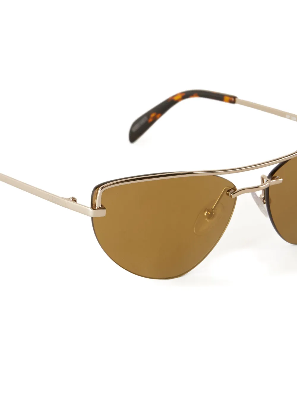 Золотистая оправа «кошачий глаз», тонкие дужки, зеркальные линзы, носоупоры. Очки поставляются с защитным футляром.