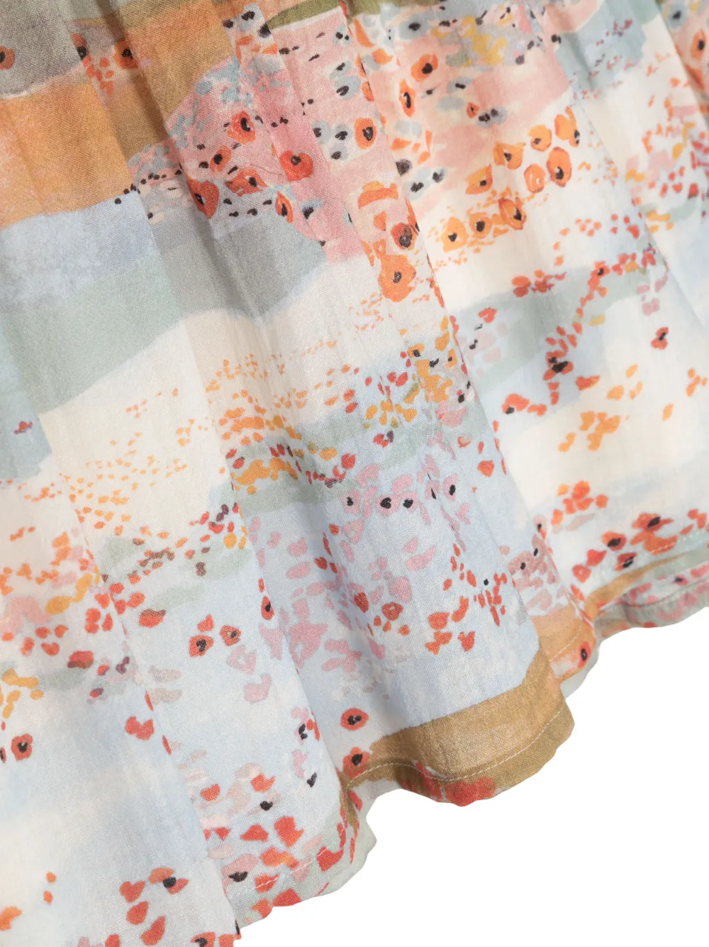 Голубой, разноцветный, хлопок, шерсть, сплошной графичный принт, вставки с оборками, вставка со сборками, складки, круглый вырез, застежка на молнии сзади, длинные рукава, эластичные манжеты и прямой подол.