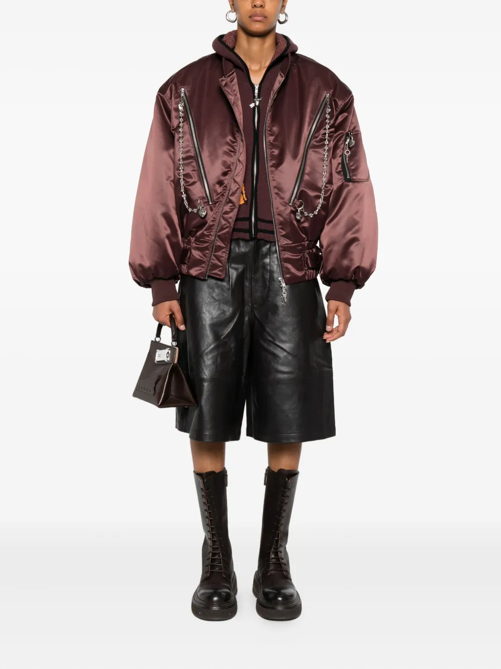 Коричневая застежка-молния спереди, цепочка, несколько карманов на молнии, пояс на подоле, ребристая отделка.