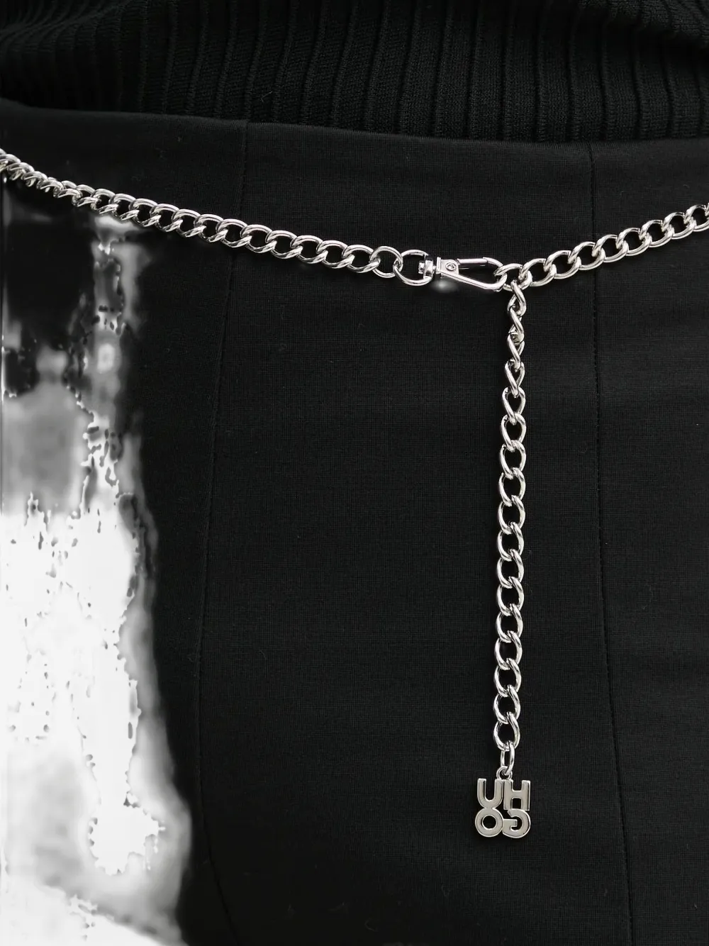 Черный ремень-цепочка с разрезом по низу и серебристой фурнитурой