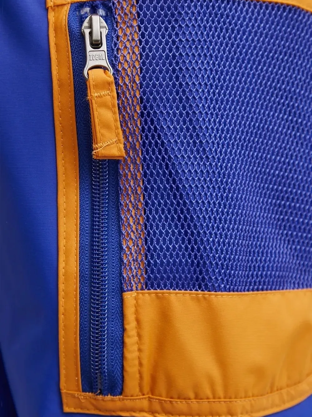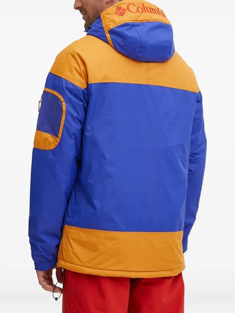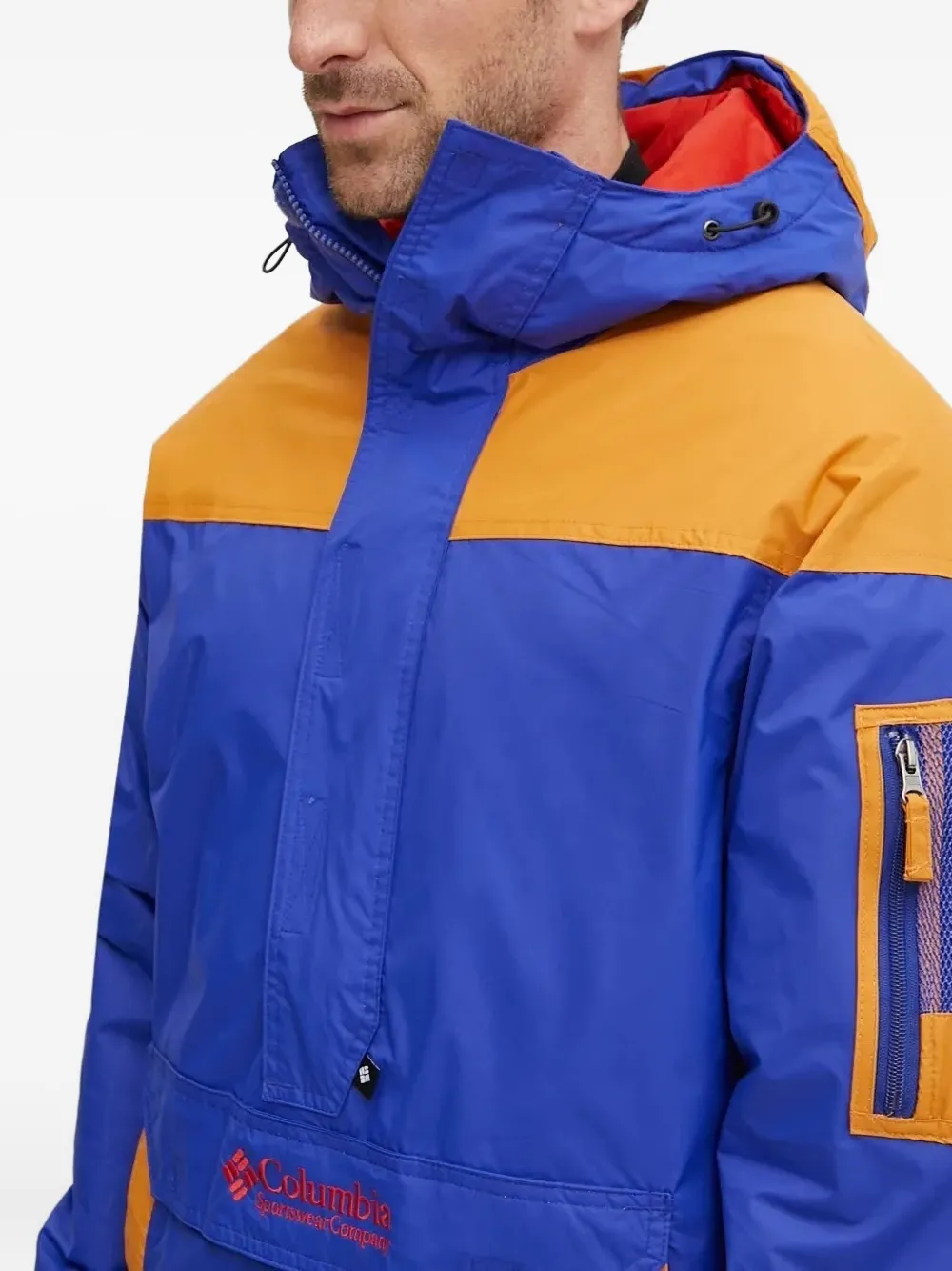 Сине-оранжевые панели, застежка-молния до середины бедра, карман, вышитый логотип, капюшон на завязках