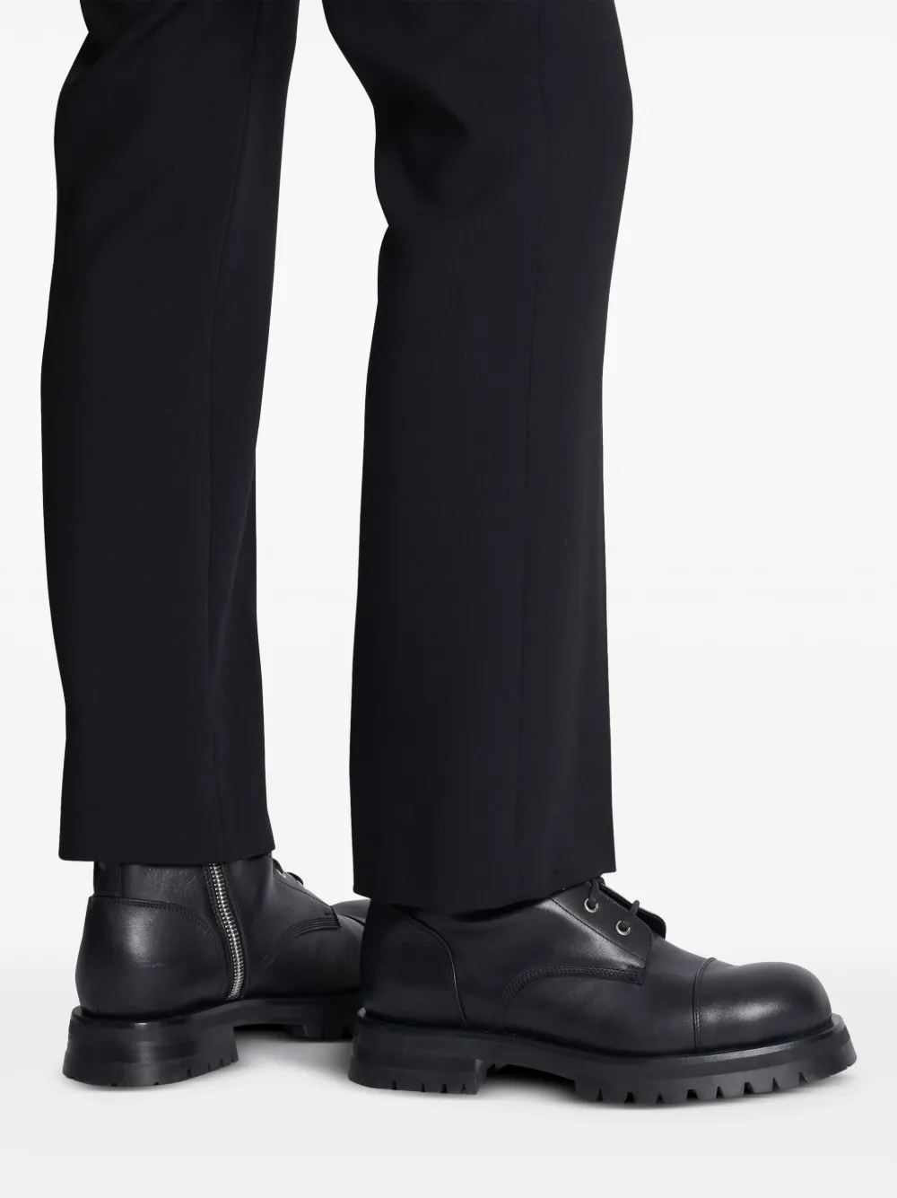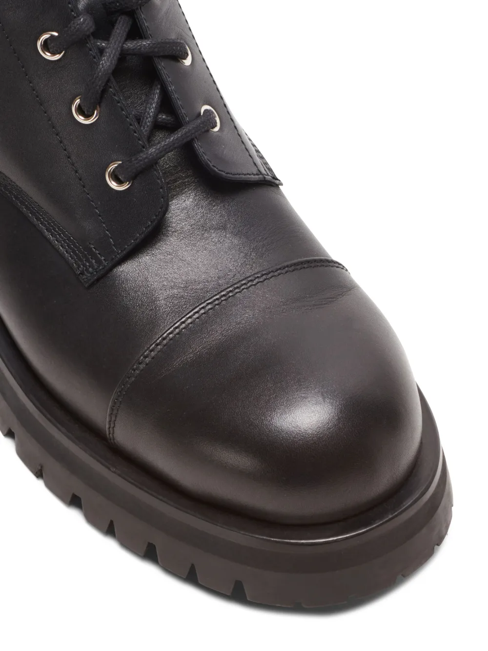 Черный, телячья кожа, металлический логотип, закругленный носок, серебристая фурнитура, шнуровка спереди, резиновая подошва и петля для подтягивания сзади.