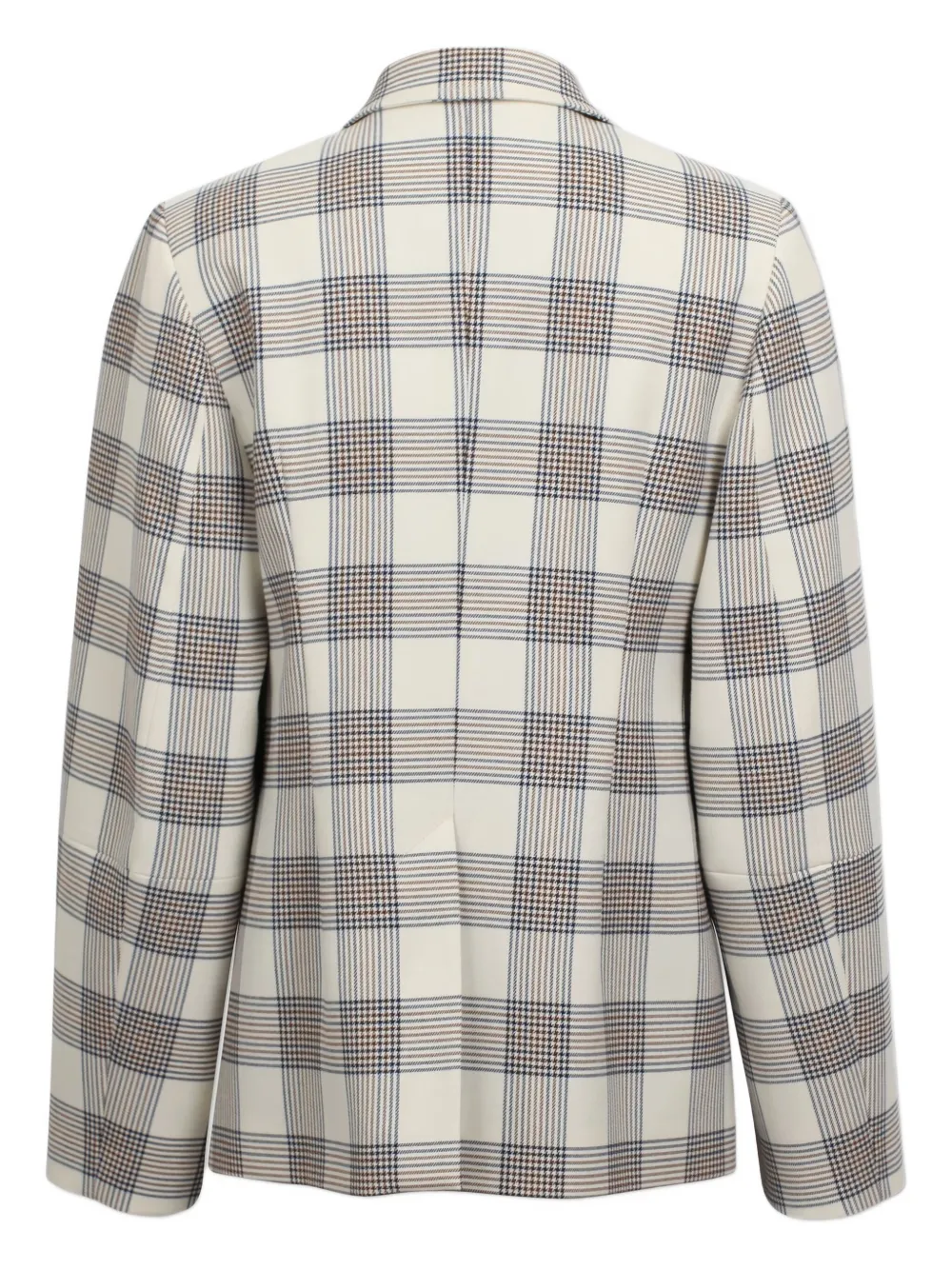 Кремовый клетчатый узор, асимметричный подол, заостренные лацканы, застежка на одну пуговицу, длинные рукава.