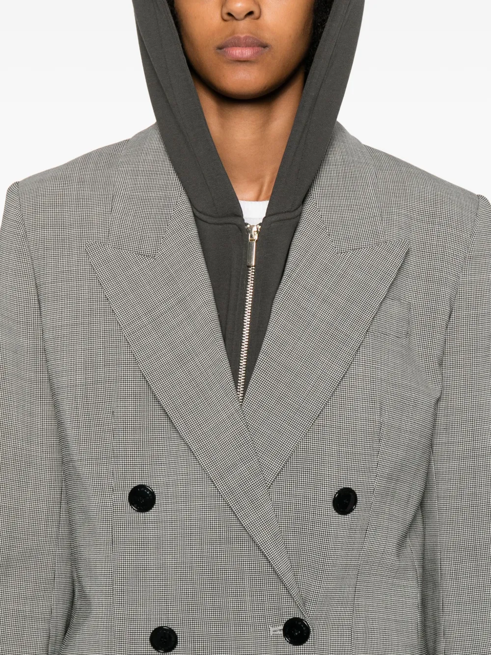 Серый узор «гусиная лапка», двубортный, застежка на четыре пуговицы, отвороты с зазубринами, длинные рукава.