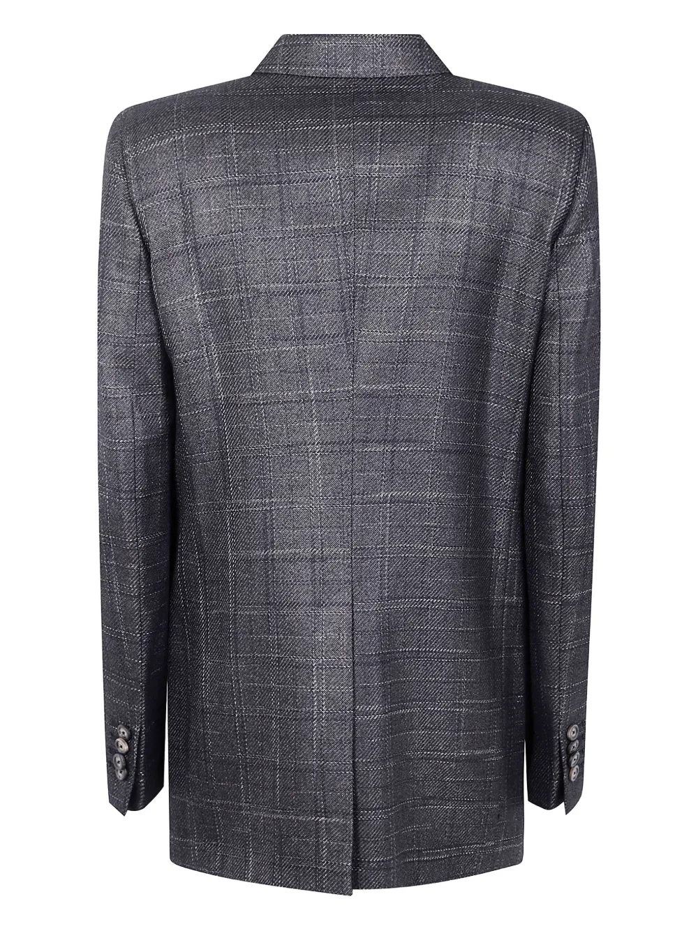 Двубортный пиджак с клетчатым узором, заостренными лацканами и длинными рукавами, застегивающимися на пуговицы манжетами.