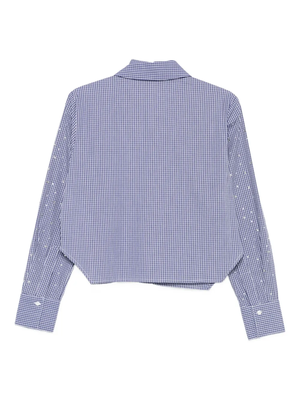 Синий клетчатый узор, украшения из кристаллов, длинные рукава, застежка на пуговицы, закругленный подол.